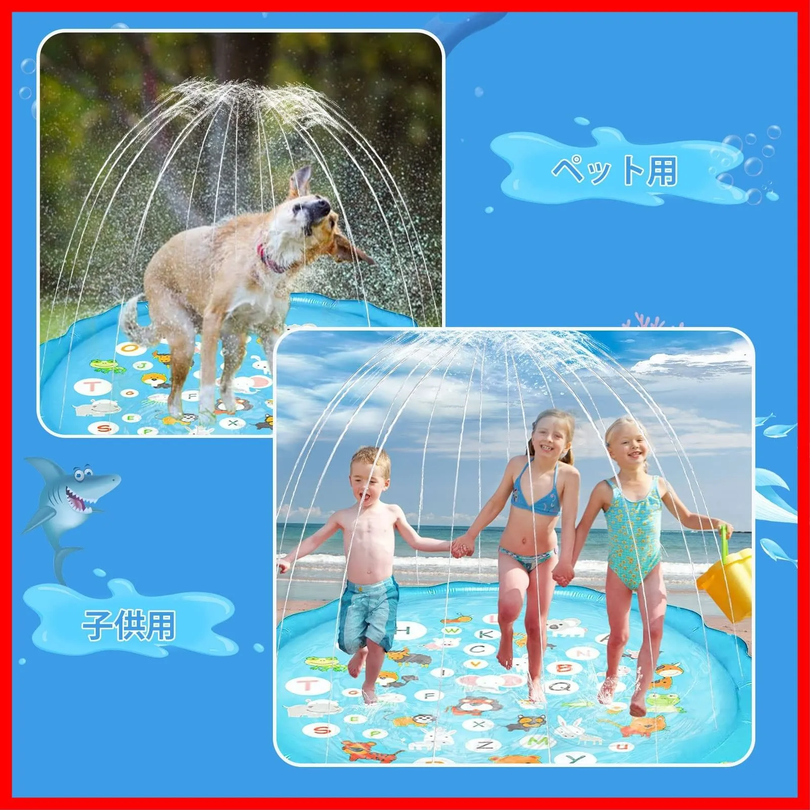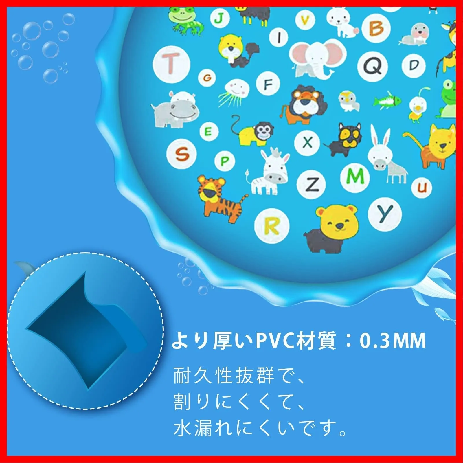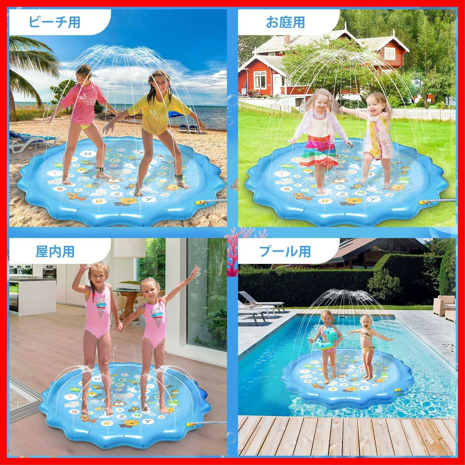 【可愛いプレイマット:】26の英字と多く動物からなるプレイマットはとても可愛いです。素敵な配色と可愛いデザイン、子供中に人気があります。子供たちは遊びながら簡単に学べ、子供の想像力を育てることができます。また、子供の遊びだけでなく、暑い日に、ペットちゃんも嬉しく遊べます。※ご注意:水を噴出し続けるためには、蛇口の水は出し続ける必要があります。