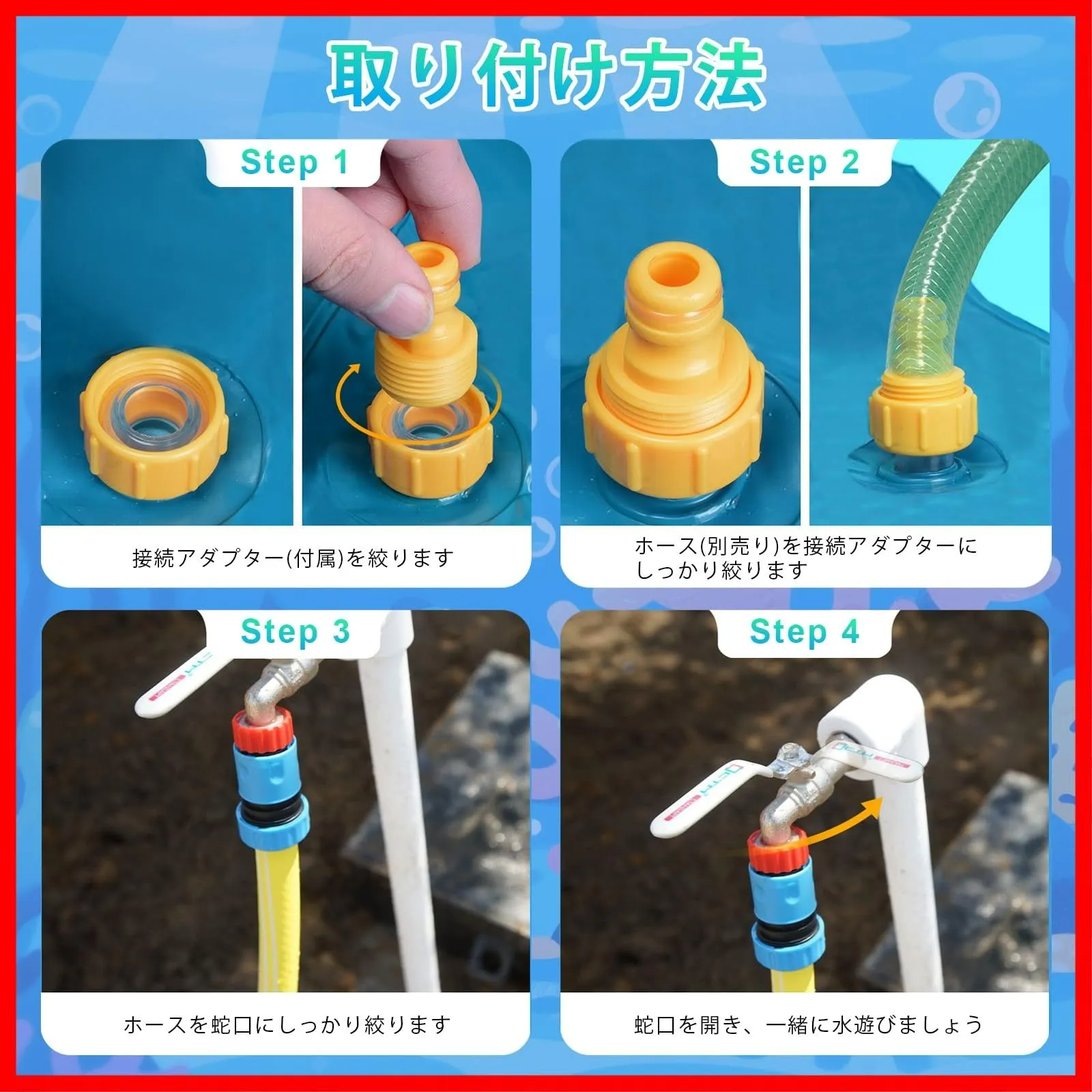 【3段階の噴水高度&空気入れ不要】水圧でマットは膨らむため、面倒な空気入れが必要ありません。平らな地面や芝生の上で置き、噴水マットを全て開き、ホース(別売り)で蛇口と接続するだけて、水は噴出します。使い方はとても簡単です。蛇口の水量を調整すれば、噴水の高さと強さは3段階(低中高)調節可能です。水圧が強いほど高さが高くて、最大約150CMに達します。子供たちの好きな美しい噴水を作りましょう。