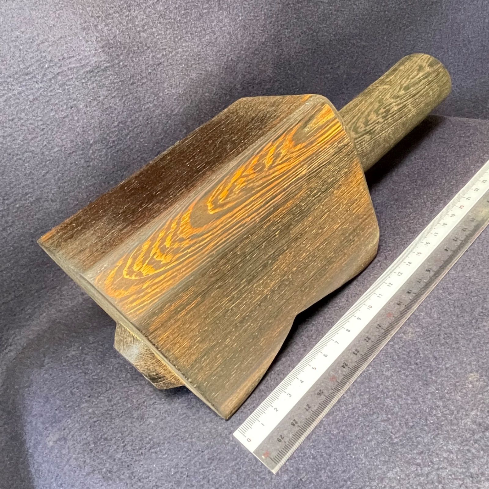 サイズ(最大値)、全長293mm、ヘッド部長さ156mm、ヘッド部幅115mm、ヘッド部厚み95mm、取っ手部長さ137mm、取っ手部幅43mm。寸法は約です。重さ1404g。素彫り(無垢)に調理用の亜麻仁油でオイルフィニッシュしました。天然木のため、ひとつひとつに個体差があるため、すべてに品番をつけています。