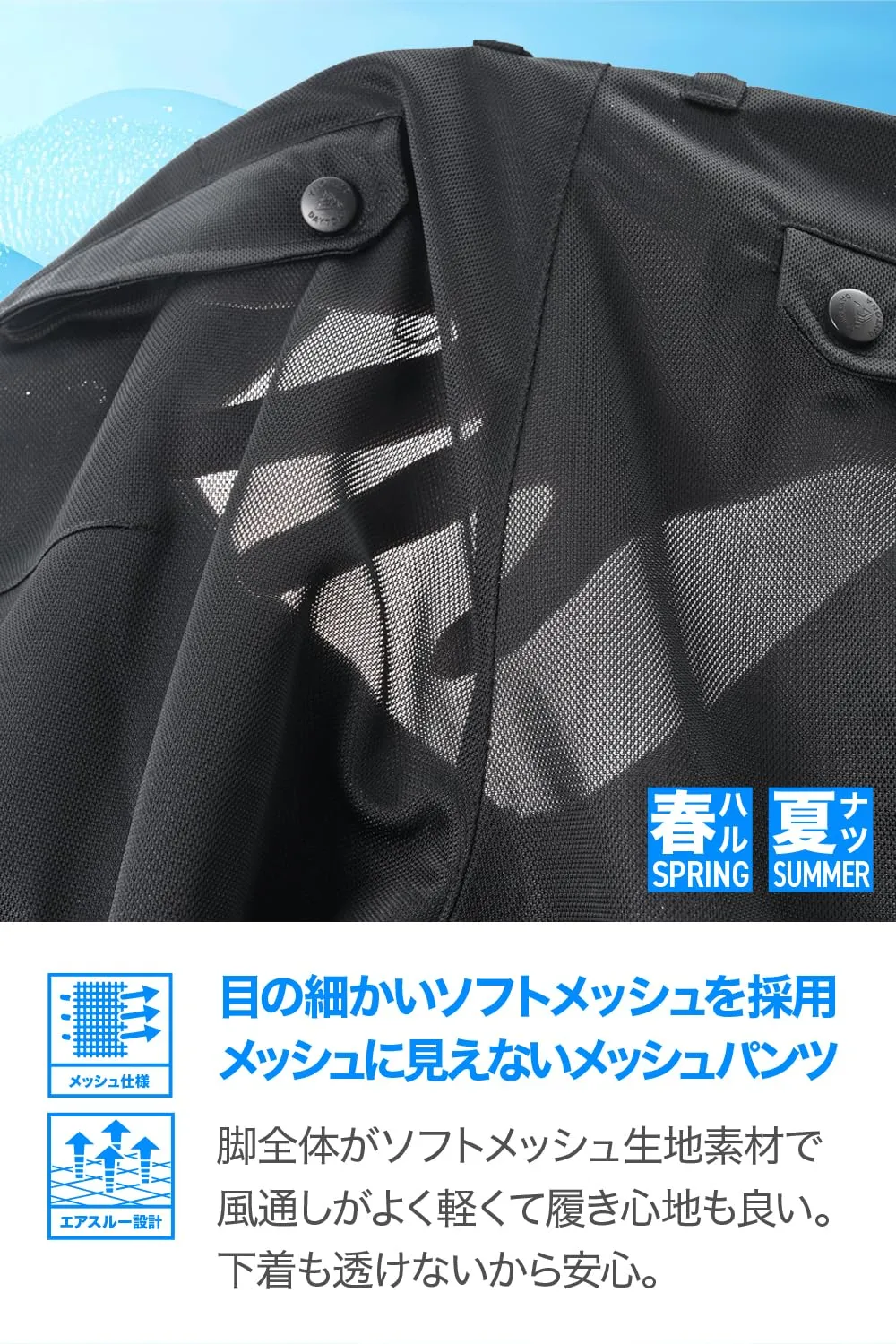 見た目はカジュアルながら、脚全体に通気性を確保したフルメッシュ仕様のライディングパンツ。