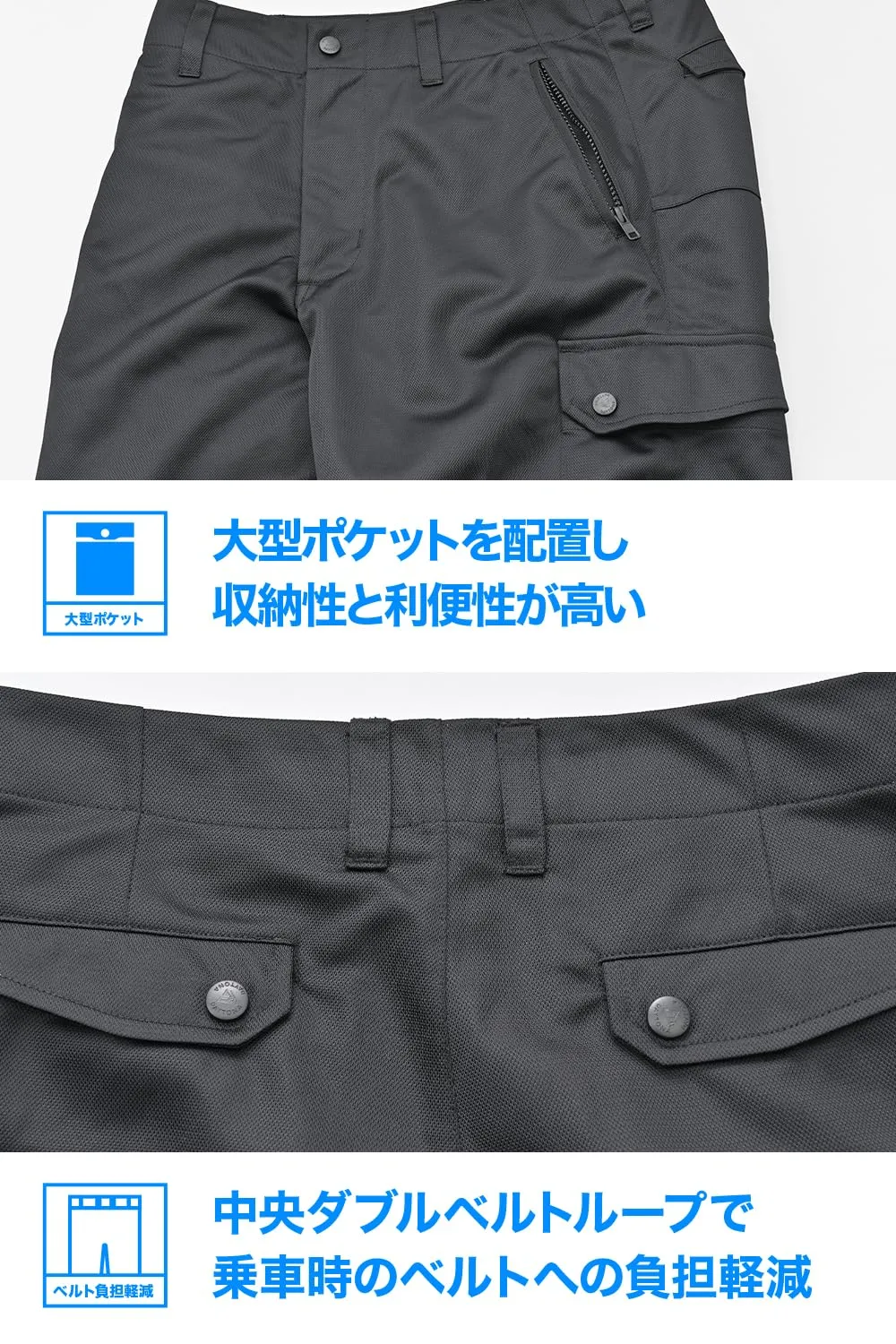 深めに設計した大型カーゴポケットを装備し、収納力が高く乗車時の動きを妨げにくい設計