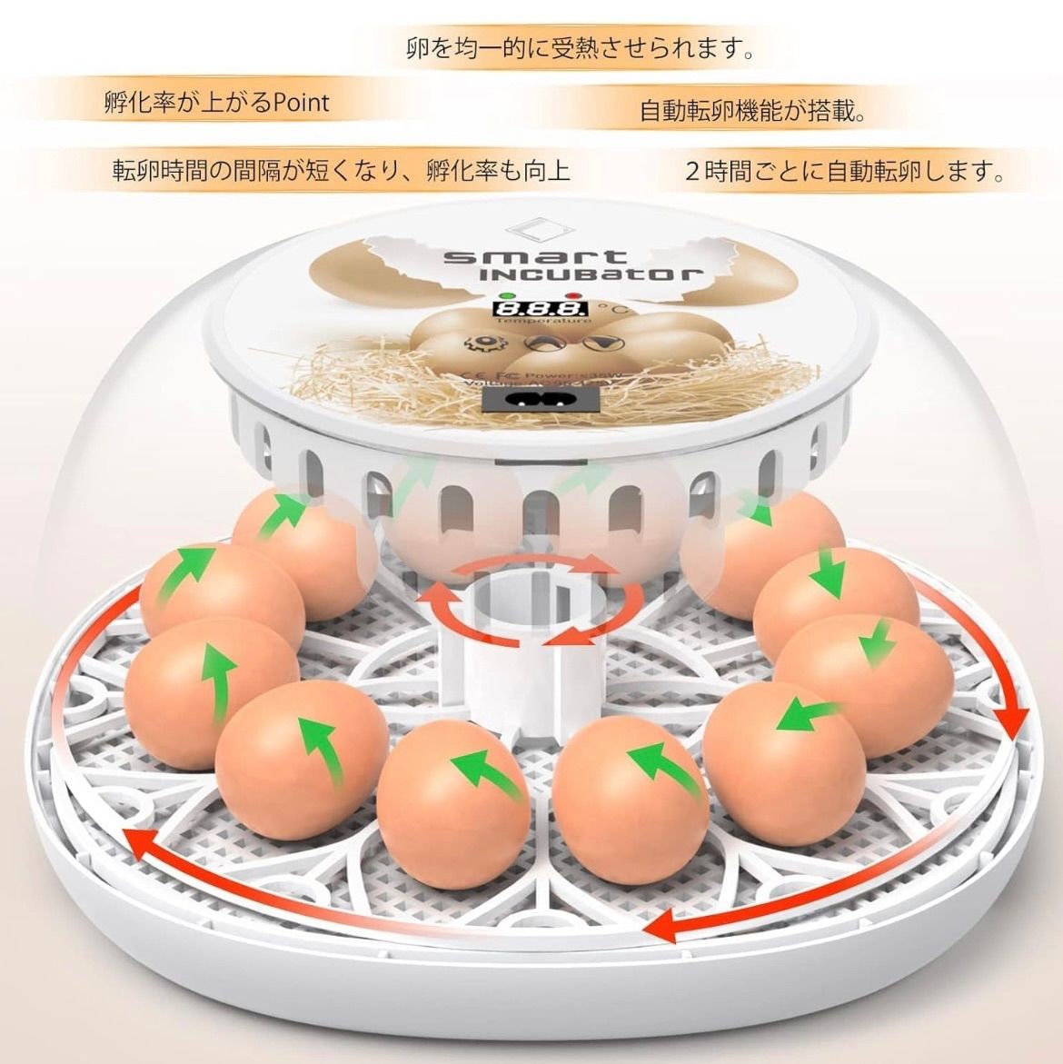 【自動転卵】スライド式自動回転卵の技術を採用し、2時間ごとに一回転卵します。自動化のため、人工的な操作が不要で、卵を孵化する全過程が秩序化されています。