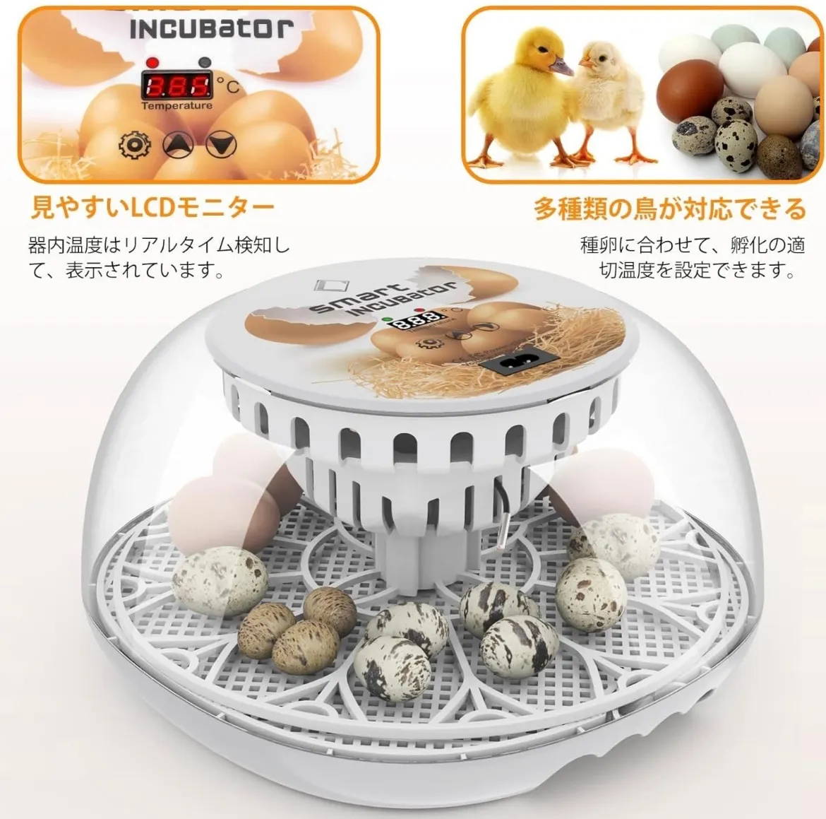 LifeBasis 自動孵卵器 インキュベーター 鳥類専用ふ卵器 自動転卵式 孵化器24個入卵OKヒヨコ生まれ 子供教育用 大容量 自動温度制御 湿度保持 デジタル表示 鶏卵 アヒル うずら 家庭用 鳥類の卵を人工孵化実現