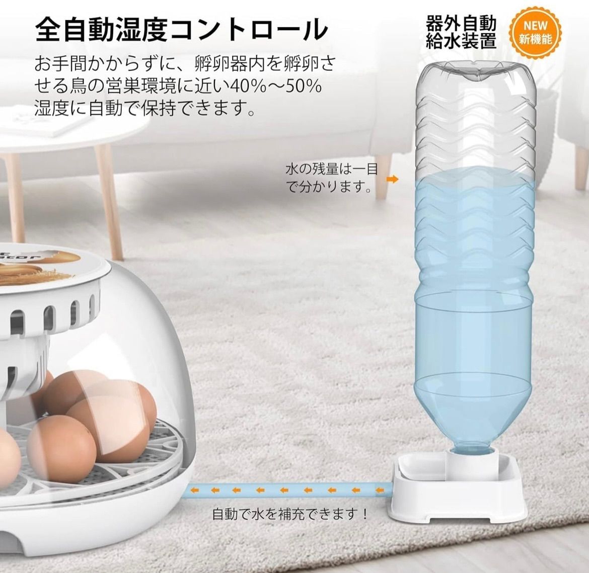 【新しい機能!器外給水装置】水の補充は器外で行うことができます。フタを開けることによる孵卵機内温湿度の急激な変化を避けられ、機内がいつも孵化に適切な温湿度まで保てます。