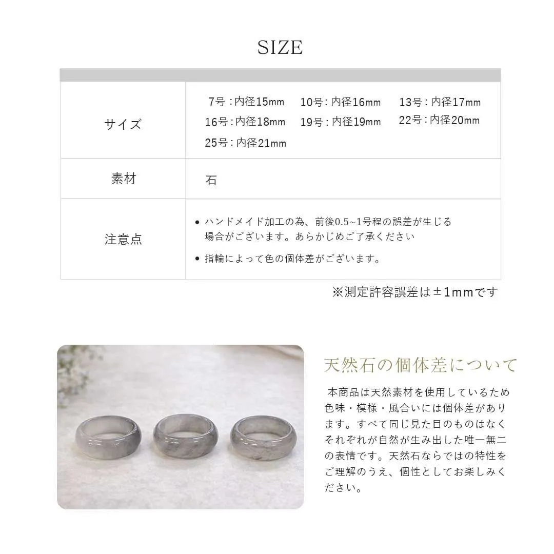 くり抜きタイプのパワーストーンリングは、金属を使わず石そのものを削り出しているため、継ぎ目のない滑らかな仕上がりと、天然石ならではの重厚感や落ち着いた艶をお楽しみいただけます。