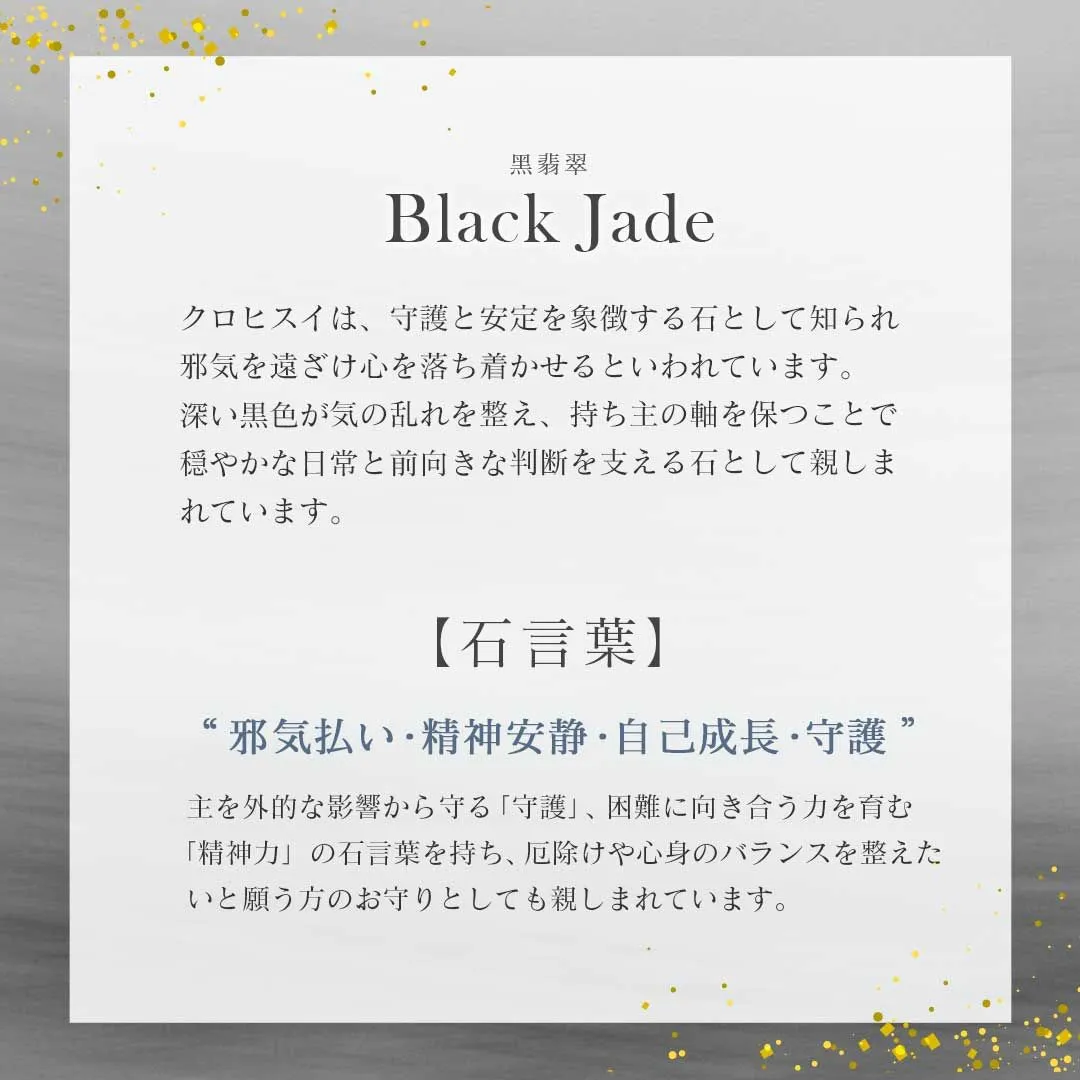黒翡翠は古来より守護の象徴とされ、「邪気払い」「精神安定」「自己成長」を支える石として伝えられてきました。持ち主を外的な影響から守る「守護」、困難に向き合う力を育む「精神力」の石言葉を持ち、厄除けや心身のバランスを整えたいと願う方のお守りとしても親しまれています。