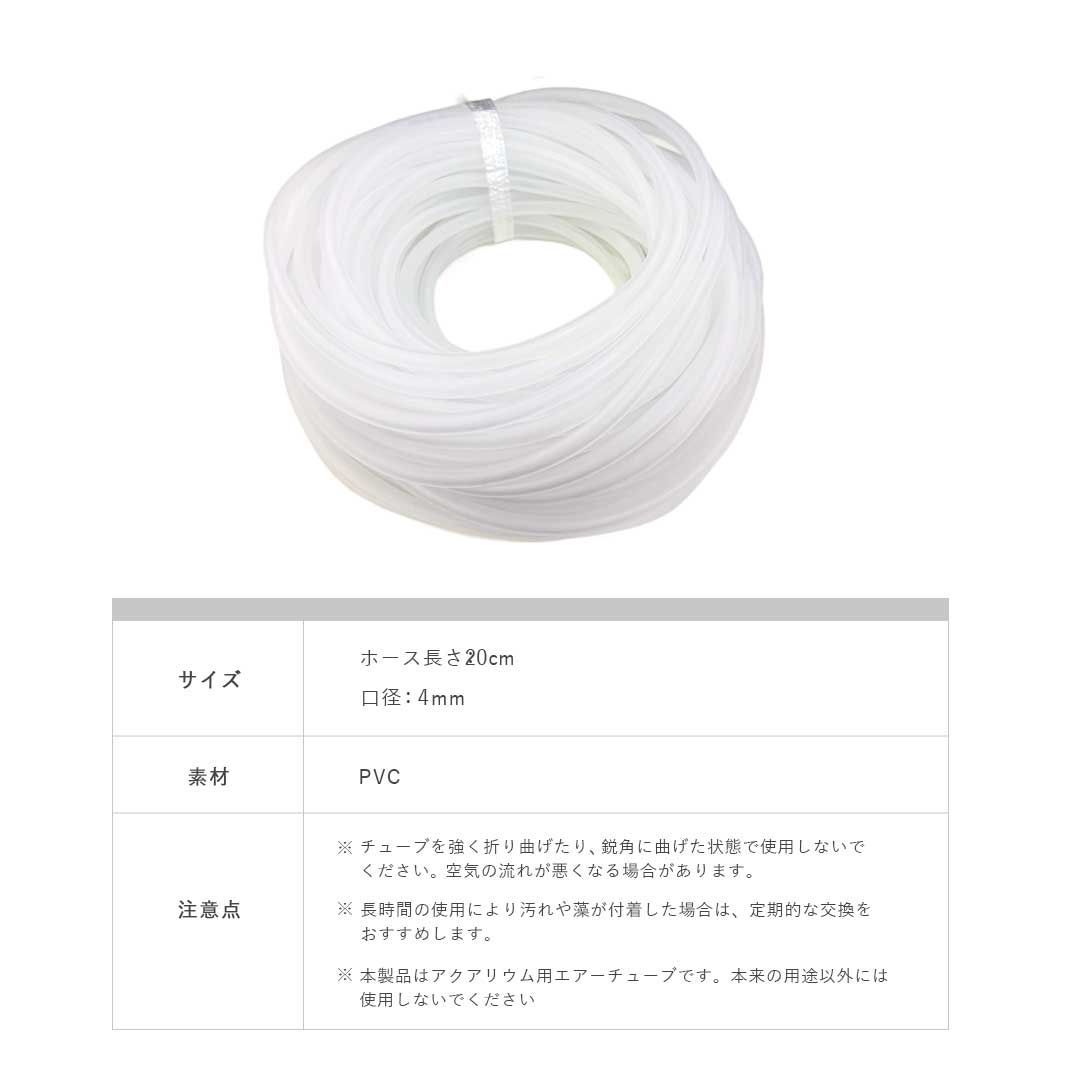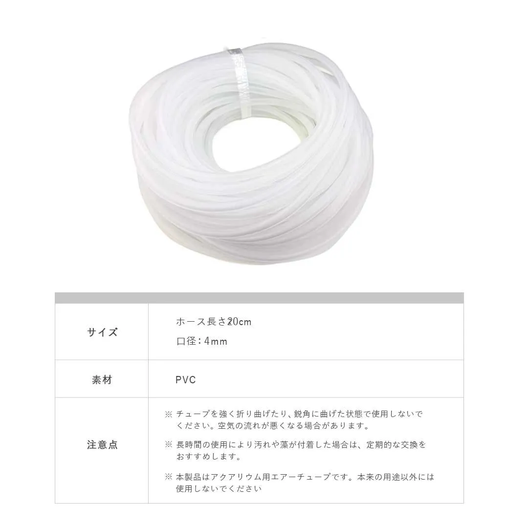 【ご使用上の注意事項】 ※チューブを強く折り曲げたり、鋭角に曲げた状態で使用しないでください。空気の流れが悪くなる場合があります。 ※長時間の使用により汚れや藻が付着した場合は、定期的な交換をおすすめします。 ※火気や高温になる場所での使用・保管はお避けください。 ※エアーポンプを水面より低い位置に設置する場合は、必ず逆流防止弁をご使用ください。 ※本製品はアクアリウム用エアーチューブです。本来の用途以外には使用しないでください。