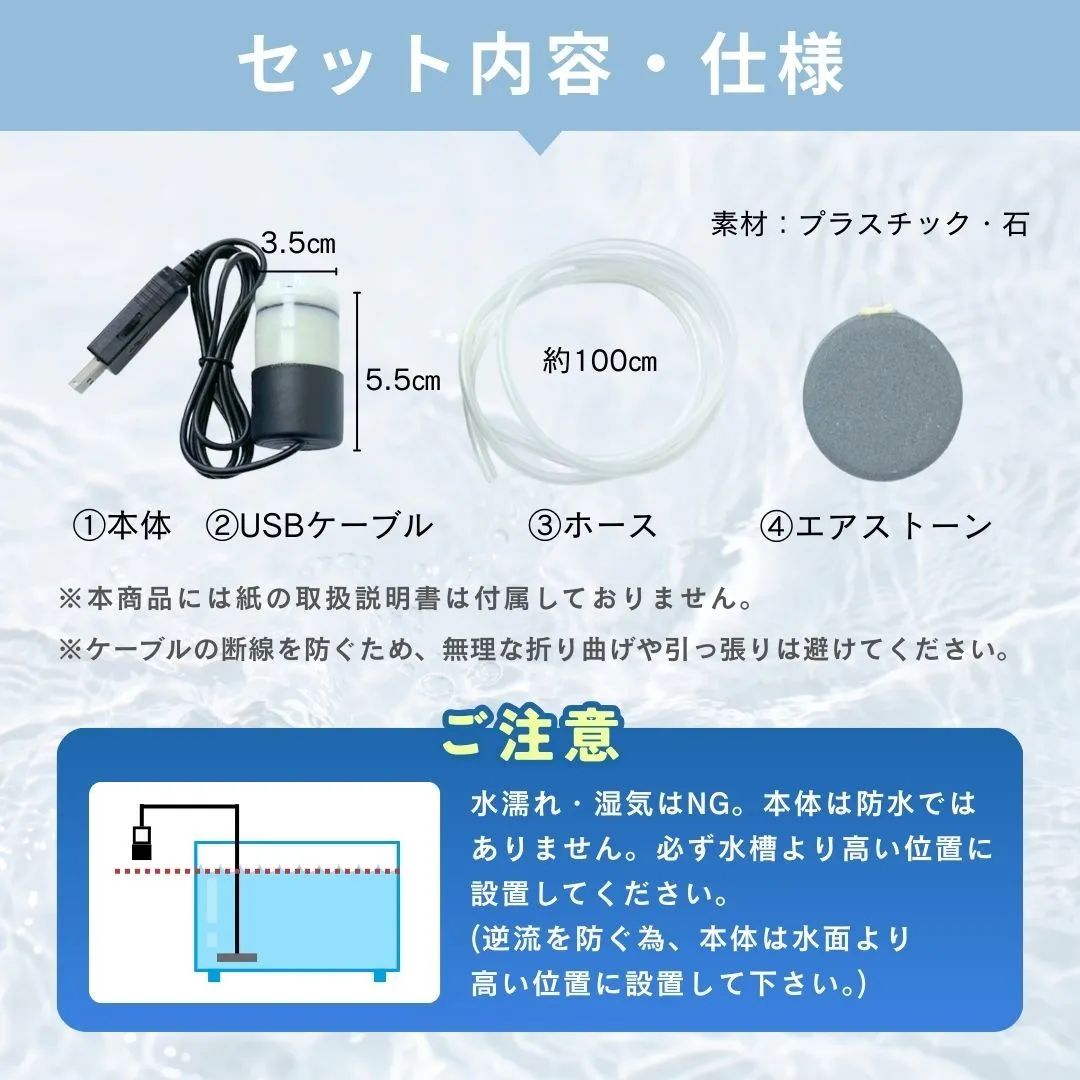 ● レビューをご記入いただくと、保証期間が100日に延長されます(要お問合せ) ※以下は保証対象外です ・出力不足のUSBアダプター使用による動作不良 ・水濡れ・湿気による内部腐食 ・USBコードの断線や破損 ・エアストーンやホースの目詰まりなど、消耗部品の劣化 ~エアレーションの役割と重要性~ “ブクブク”はただの泡ではありません。魚たちの命を守る大切な存在です。