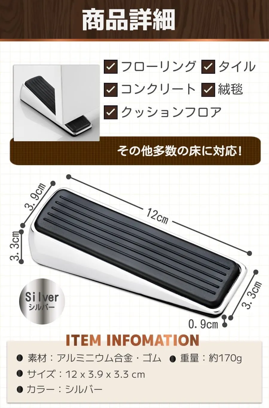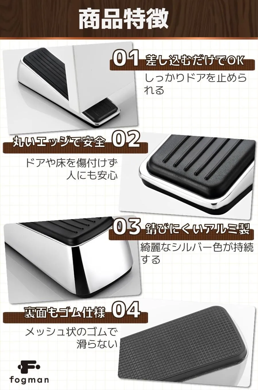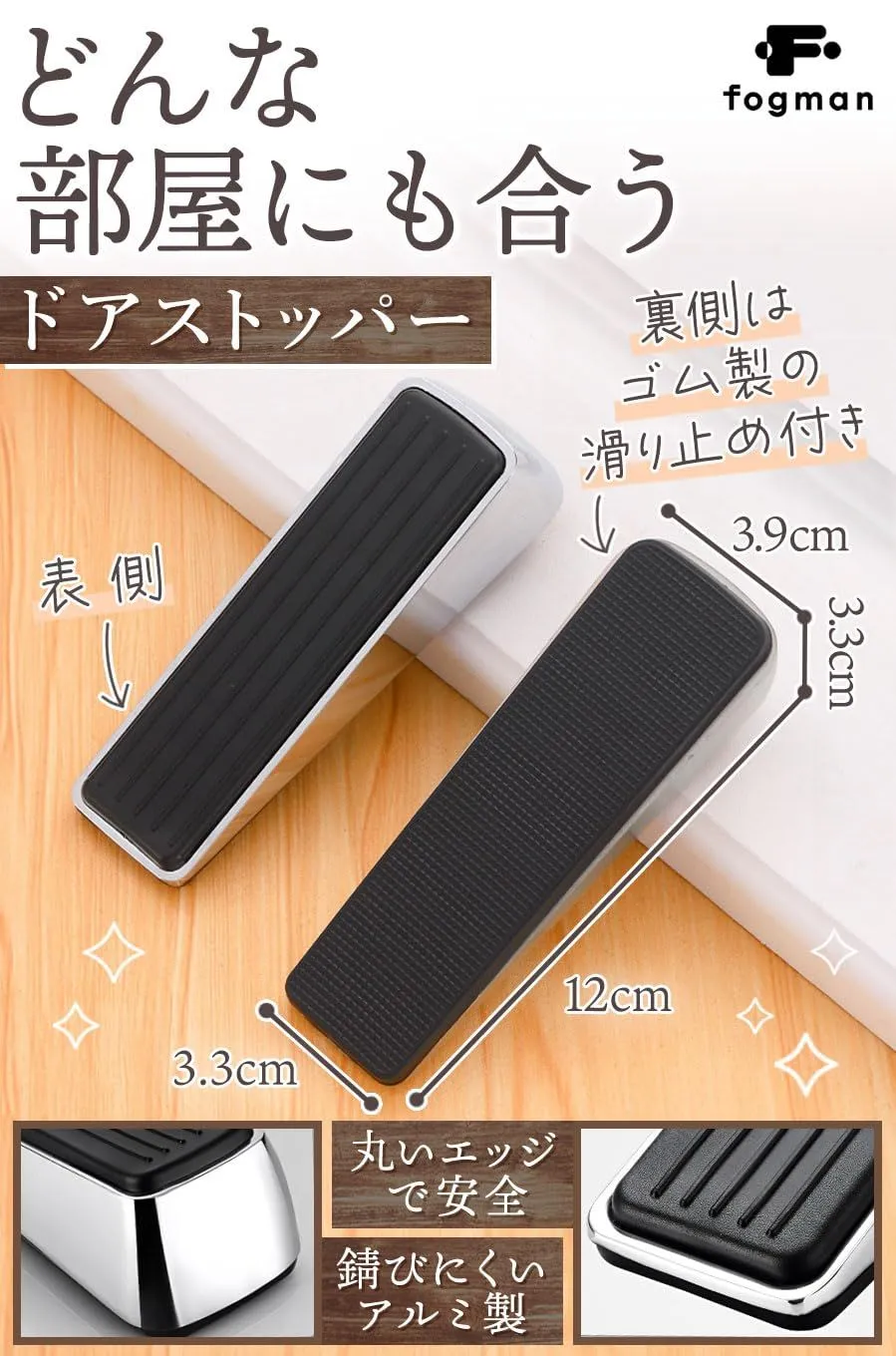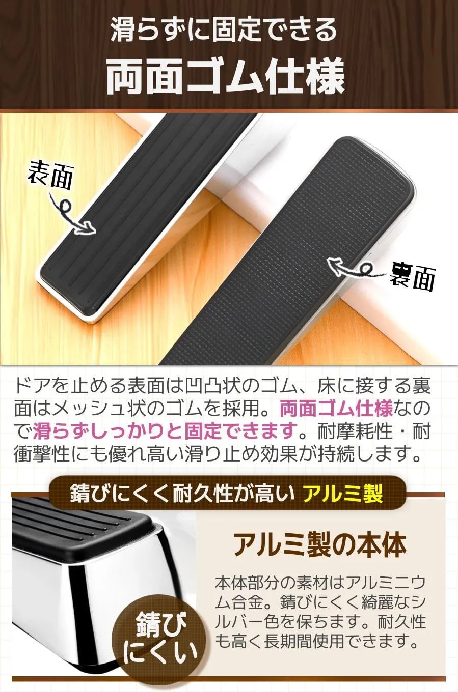 【商品特徴】①差し込むだけでOK:しっかりドアを止められる/②丸いエッジで安全:ドアや床を傷付けず人にも安心/③錆びにくいアルミ製:綺麗なシルバー色が持続する/④裏面もゴム仕様:メッシュ状のゴムで滑らない