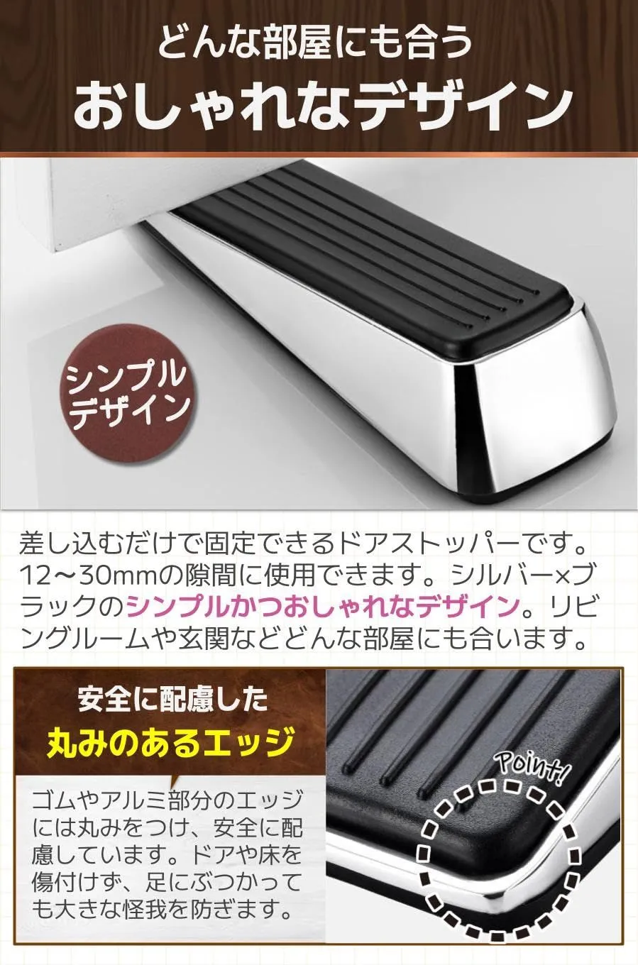 【おしゃれなデザイン】差し込むだけで固定できるドアストッパーです。12~30mmの隙間に使用できます。シルバー×ブラックのシンプルかつおしゃれなデザイン。リビングルームや玄関などどんな部屋にも合います。