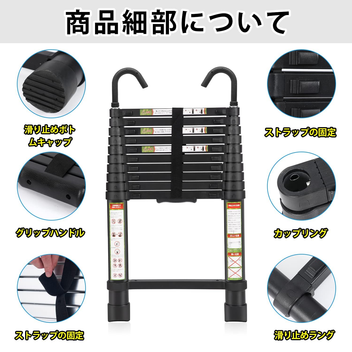RIKADE 伸縮はしご 耐荷重150kg 軽量 持ち運びやすい 折り畳み 伸縮梯子 多機能アルミはしご 自動ロック スライド式 伸縮自在 室内室外両用 フック付き(ダークブラック.3.2)