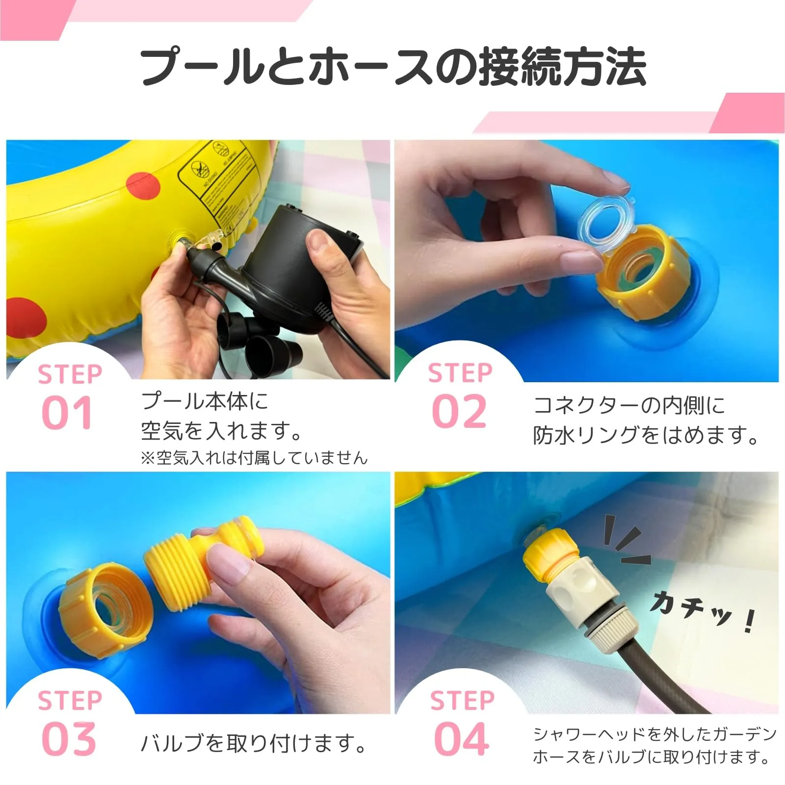 【日本規格で取り付け簡単!説明書付き!】他社は海外規格のため、プールとプールとホースが接続できない可能性がありますが、当店は日本規格なので家庭用のガーデンホースに繋ぐだけで簡単に遊ぶことができます!すぐに取り付けできるように分かりやすい説明書付き♪