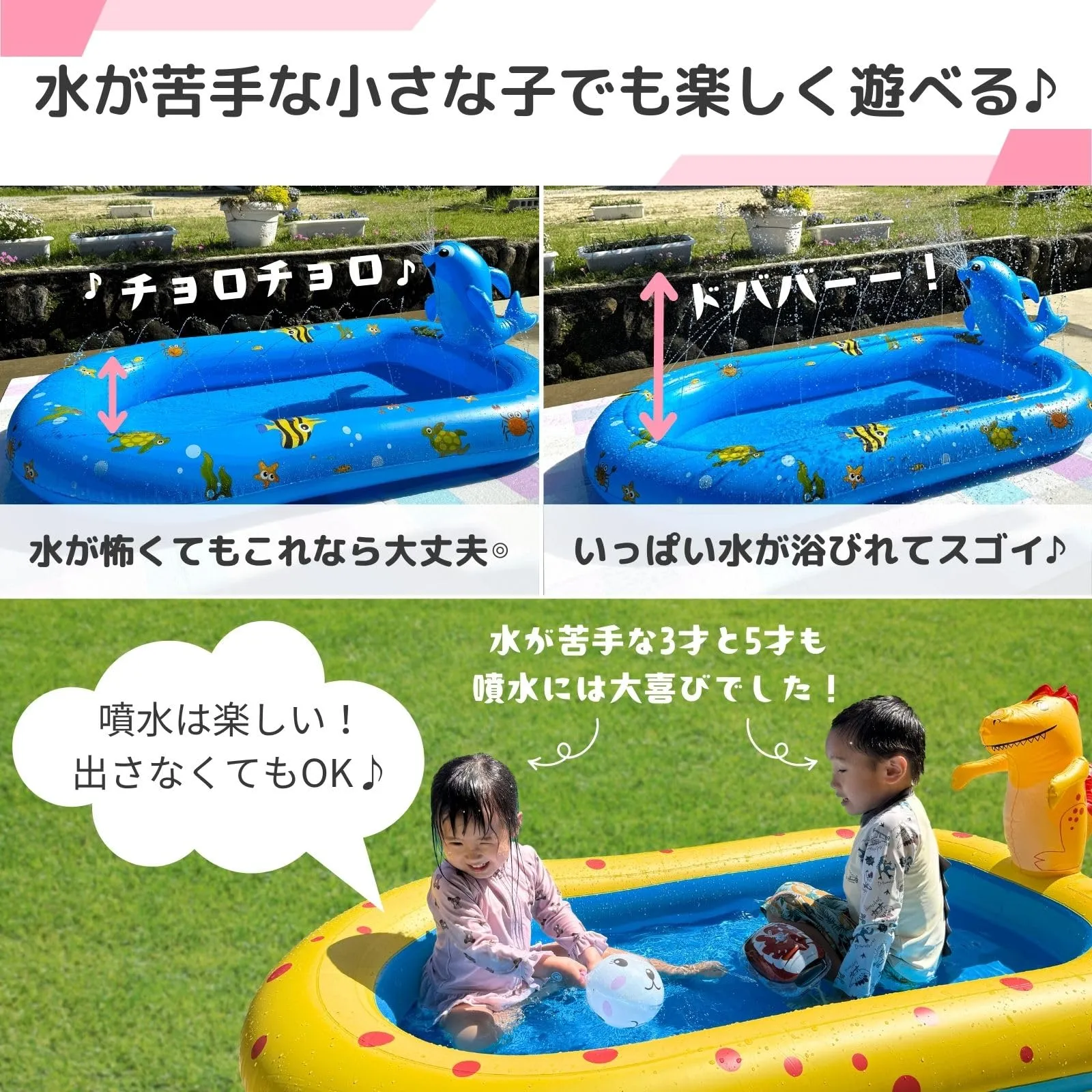 【特価セール】幼児用 ビニールプール 噴水 噴水プール 170cm x 105cm 噴水シャワー 子ども 幼児向け 屋外 ベビー マット 自宅 庭 小さめ 折りたたみ スプリンクラー ファミリー 水遊び キッズ レジャー ベランダ用 家庭用 恐竜 イルカ (恐