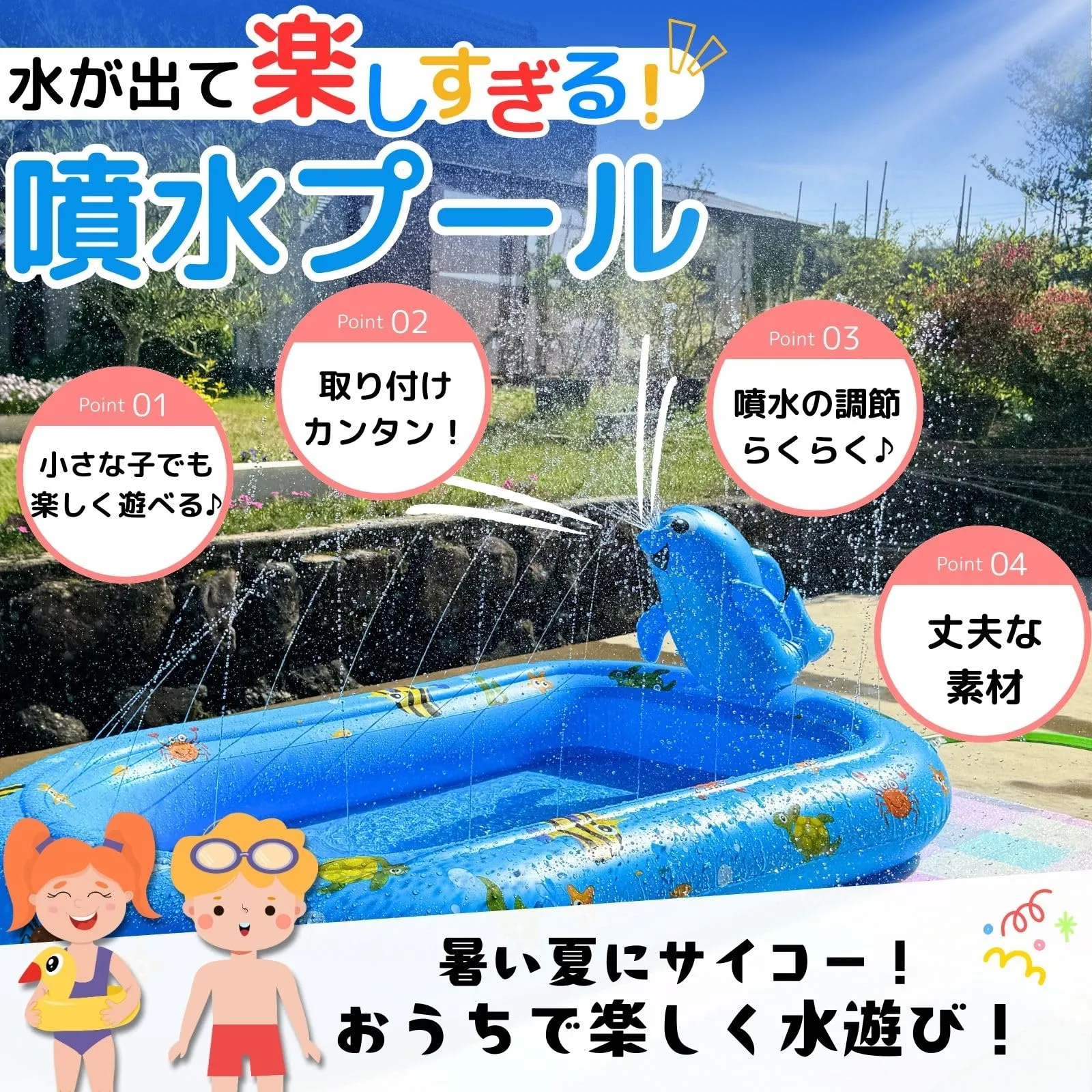 【サイズ・仕様】大きさ:170cm×105cm×65cm 付属品:説明書 幼児や小さな子どもが遊びやすい♪たくさん噴水が出るプール!水が怖くても噴水を小さくすれば大丈夫◎噴水シャワーを大きくすればたくさん水浴びできて大盛り上がりです! 日本規格なので家庭用のガーデンホースに繋ぐだけで簡単に遊ぶことができます!すぐに取り付けできるように分かりやすい説明書付き♪ 最後までご確認頂き誠にありがとうございました。 ご確認頂き、ご購入いただけましたら幸いです。 何かご不明点などがございましたらお気軽にメッセージからお問い合わせ下さい。