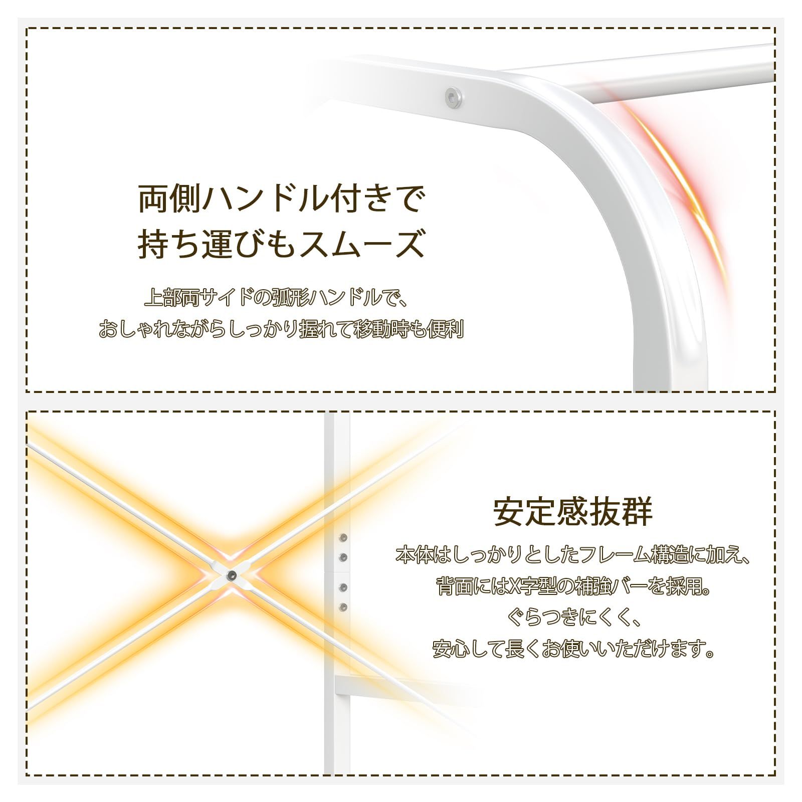 【安全構造】頑丈なスチールフレームに、耐久性に優れたメラミン化粧板を採用。熱・傷・汚れに強く、お手入れも簡単。ストッパー付きキャスターと耐震・転倒防止パーツ設計。強度を強化するために本体の後ろにX字鉄筋構造をデザイン。