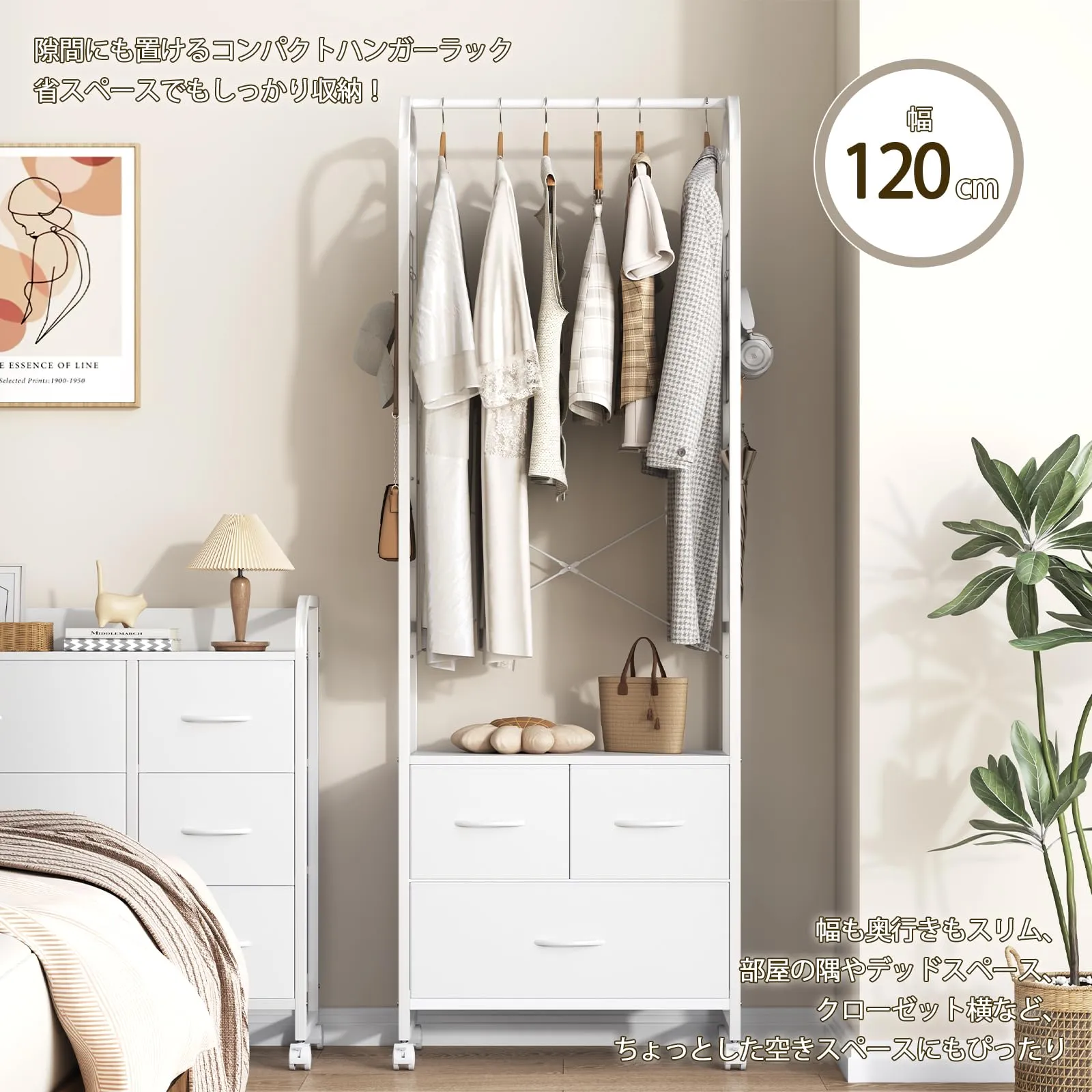 LunarLight ハンガーラック チェスト タンス 隙間収納 デッドスペース クローゼット 収納棚 収納チェスト ストッパー付きキャスター 引き出し付き サイズ幅60奥行29高さ175㎝ コンパクト おしゃれ 収納ケース 耐震転倒防止(真っ白)