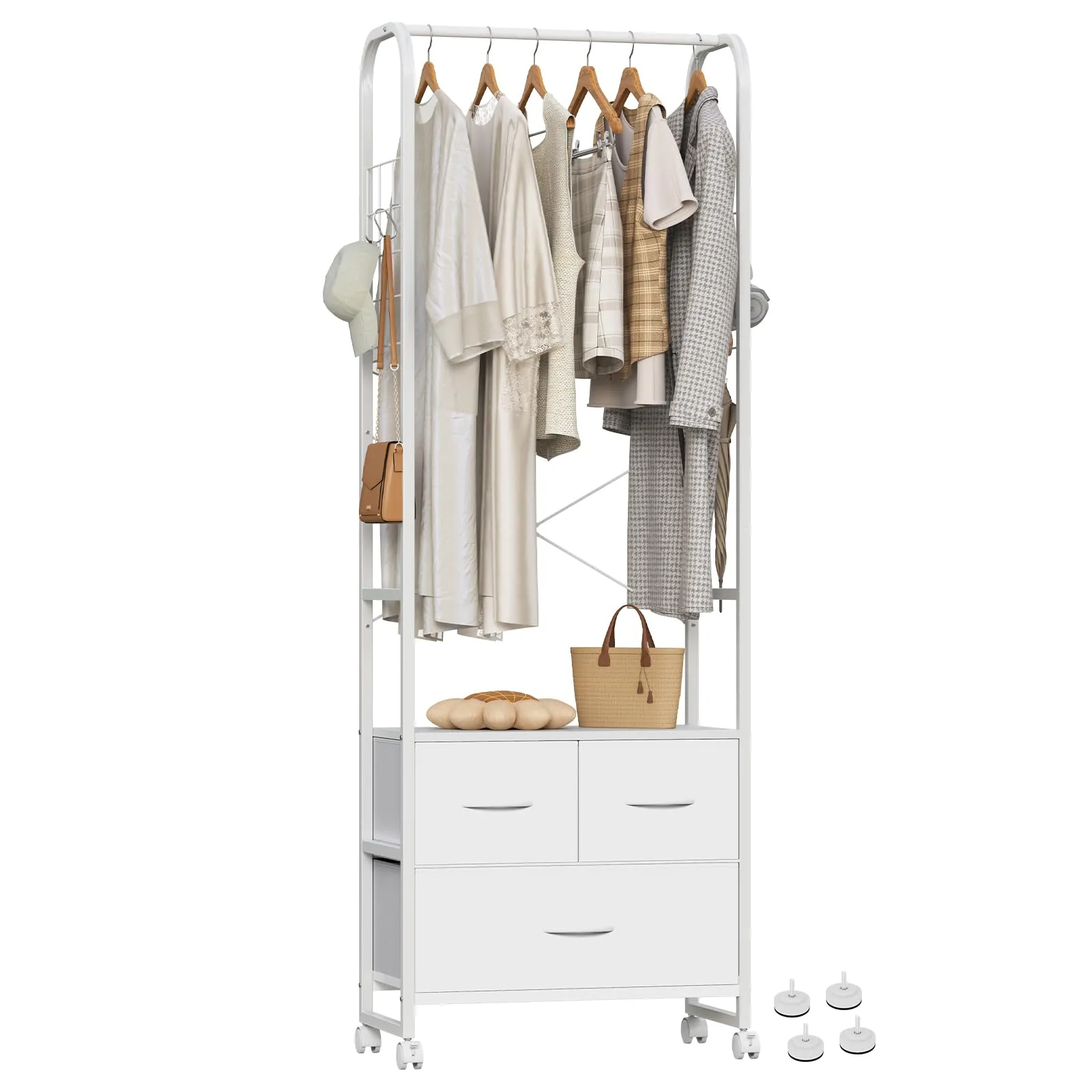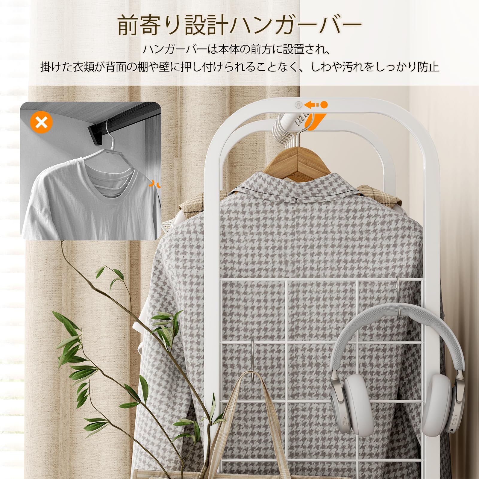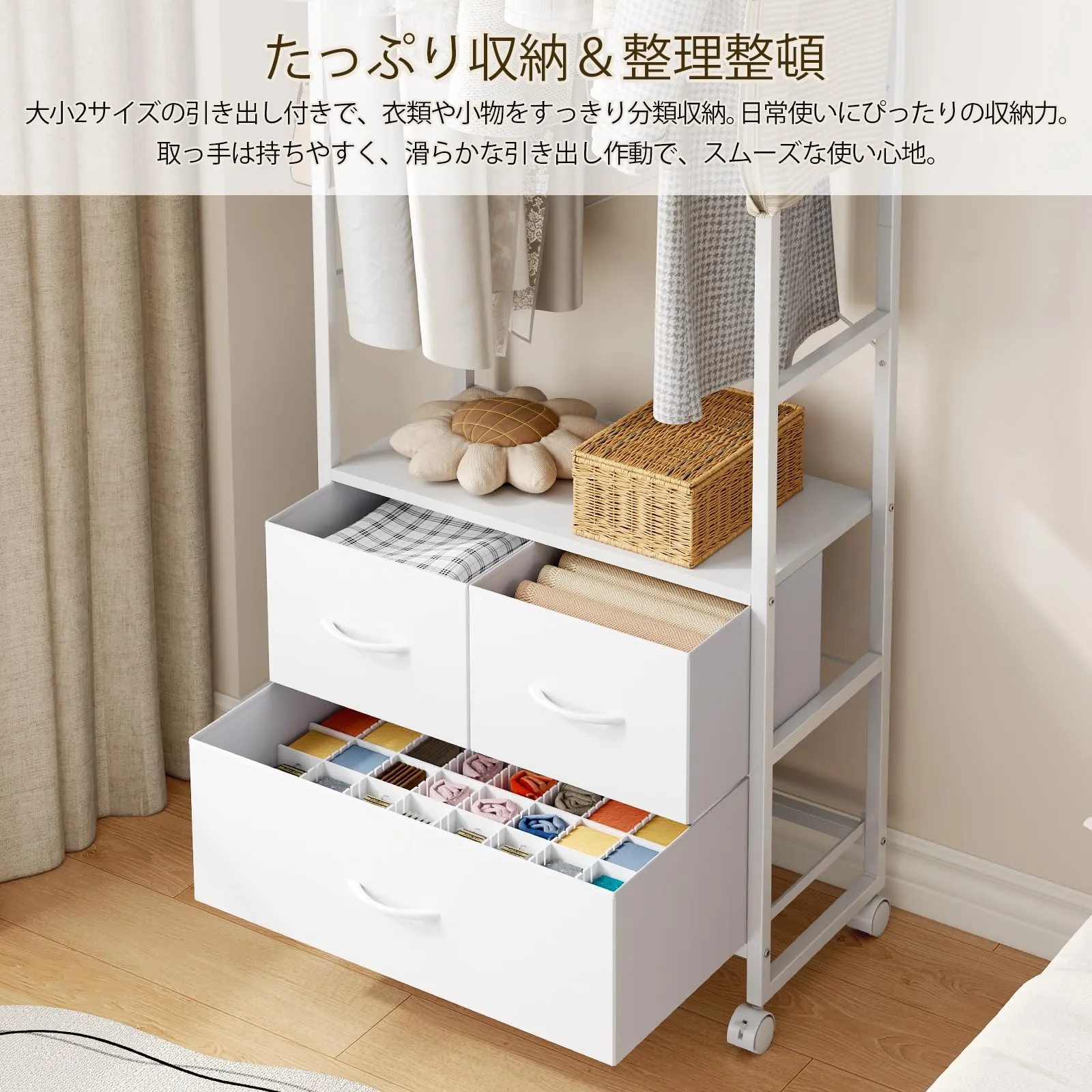 【多機能収納】レバーを本体の前面の位置に配置することで、衣服が壁に押しつぶされるのを防ぎ、汚れや折れ目も防ぎ、清潔で美しい状態を維持。大小の引き出し三つで衣類や小物をすっきり整理。不織布素材で中身が見えず、ホコリも防止。背面には引き出しの転落を防止するためのデザインが施され、転落の心配がない。上部両側にスチール網が付き、付属のSフックと組み合わせて使用可能。下部に空きスペースがあり、靴にもバッチリ対応。