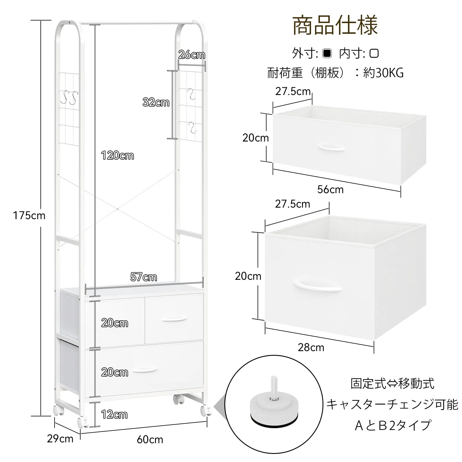 【在庫セール】コンパクト サイズ幅60奥行29高さ175㎝ 引き出し付き ストッパー付きキャスター おしゃれ 収納チェスト 収納棚 クローゼット 収納ケース デッドスペース 隙間収納 タンス 耐震転倒防止(真っ白) チェスト ハンガーラック LunarLigh