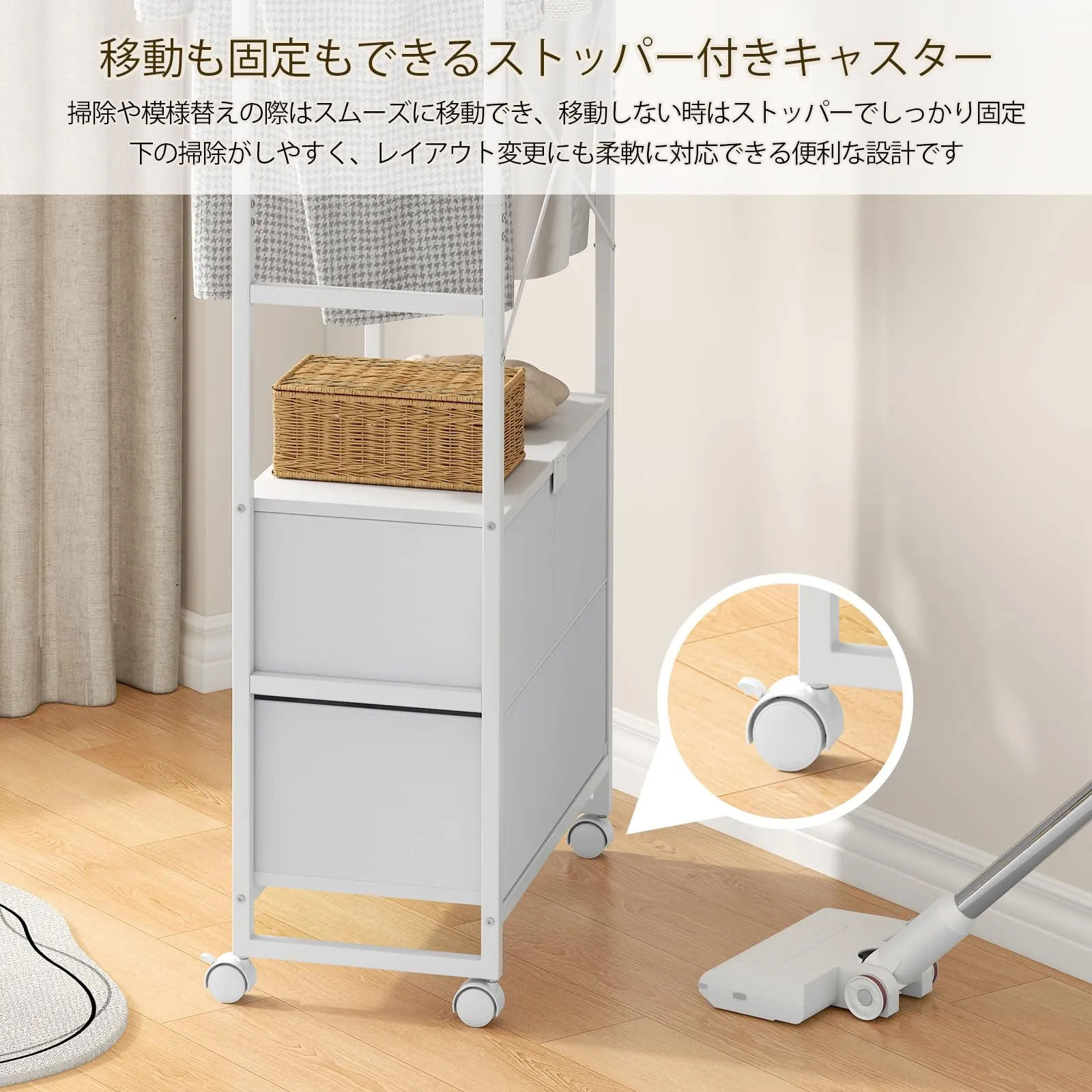 【移動も簡単】キャスター付きで移動ラクラク。ストッパー機能でしっかり固定可能。掃除や模様替えにも便利。