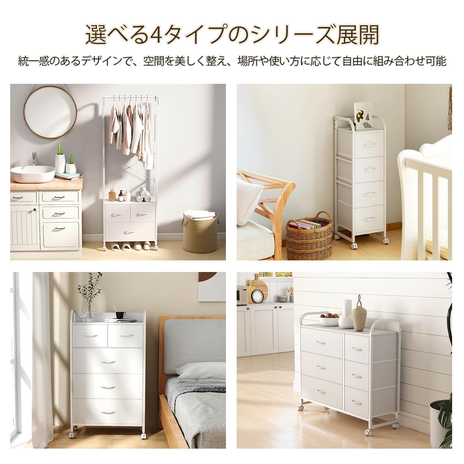 【シリーズ展開】本チェストは同シリーズで全4タイプをご用意。高さ・幅・引き出しのサイズや数がそれぞれ異なり、収納したい物や設置スペースに合わせて最適なタイプをお選びいただけます。リビングや寝室、子供部屋など、あらゆる部屋スタイルに対応可能です。