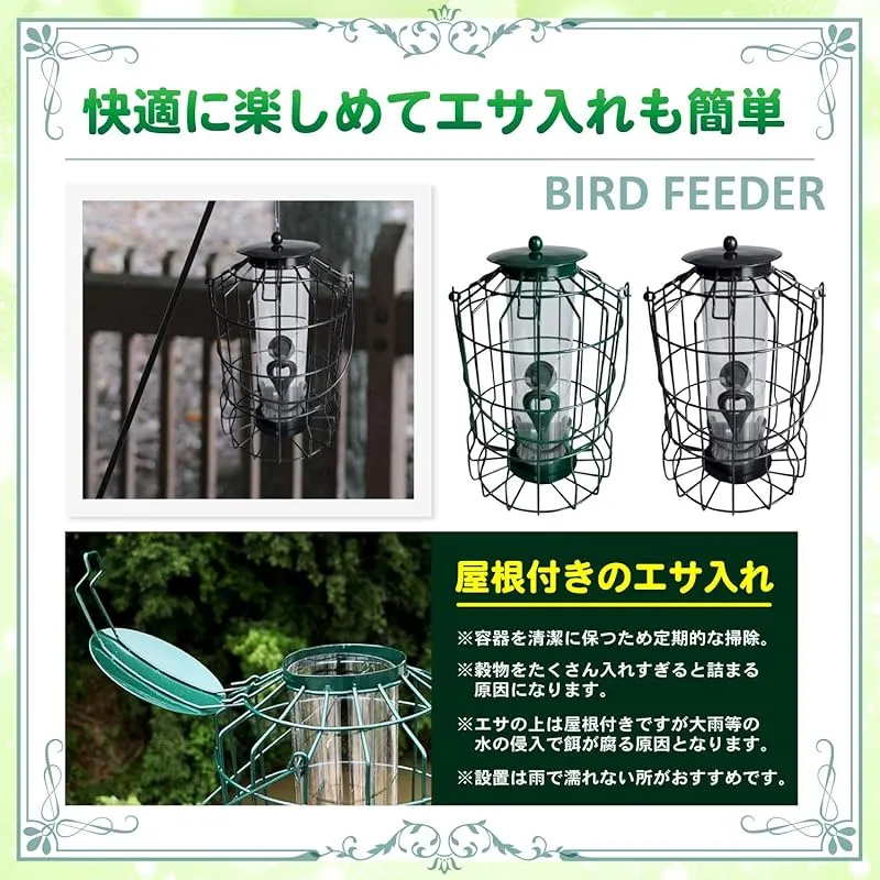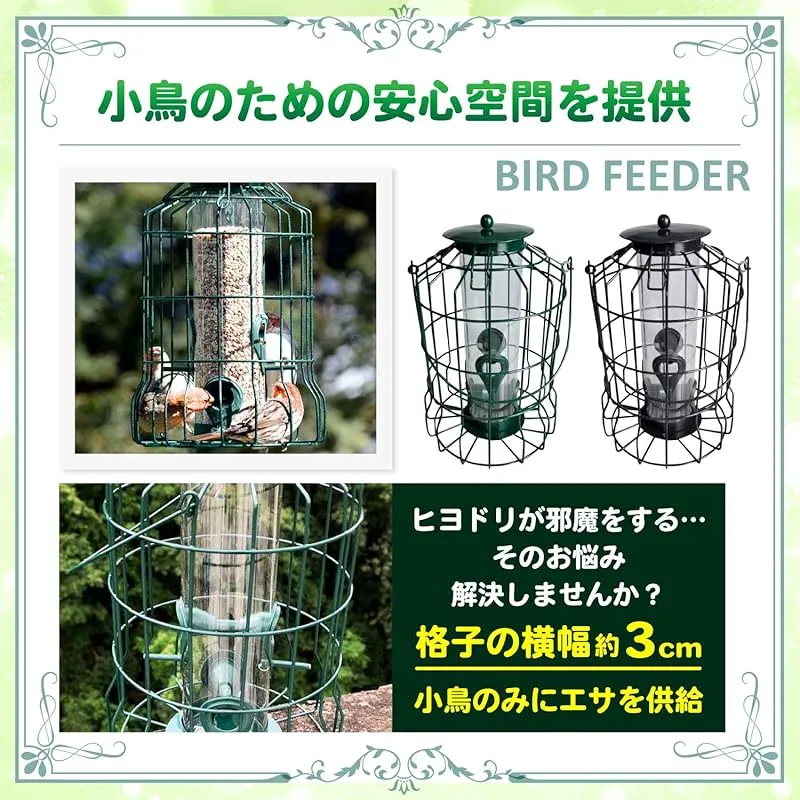 【商品概要】 バードフィーダー ヒヨドリよけ えさ台:庭でゆっくりと野鳥観察は楽しいですが、ヒヨドリに邪魔されるのは困りますよね。そんなお悩みに、ヒヨドリ対策をした、小鳥だけにエサを提供する野鳥の餌台が登場です。黒のエサ台です。 鳥のえさだいは、一般的な鳥の餌台を設置しても、ヒヨドリが大きな声でやってきては騒ぎ立て、他の小鳥たちが近寄れない、という経験はありませんか?鳥餌台に来るヒヨドリをどうにかしたい。鳥のエサがみんな食べられてします。そんな悩みを解決するのがこのバードフィーダーです。こちらは 野鳥 餌入れ 屋外用です。 鳥のえさ台は、防護柵付きでヒヨドリ侵入を防ぎ、小鳥たちの安心空間を実現。約3cmの格子で、小鳥が快適に食事を楽しめる設計。エサ補充も簡単。メジロ、シジュウカラ、ヤマガラなど、小鳥たちが安全に食事を楽しめるバードフィーダー 屋外です。 バードフィーダー オクガイのサイズとカラー:25cm(底から取手まで)、取手14.5cm、幅17cm ブラックとグリーンの2色 ※モニターの環境によっては、実際の色と若干異なる場合があります。※ヒヨドリの大きさによっては中に入れる場合もございます。また、ヒヨドリより小さいムクドリの場合も同様となります。 推奨事項:バードフィーダー 吊り下げは、容器を清潔に保つため定期的な掃除。穀物をたくさん入れすぎると詰まる原因になります。エサの上は屋根付きですが、大雨等の場合水の侵入で餌が腐る場合もございます。設置は雨で濡れない所がおすすめです