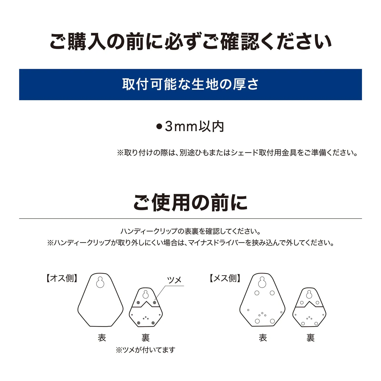 ●合成樹脂製品のため、紫外線による変色、欠け、ひび割れなどが生じる場合があります。 すだれやシェードの取り付け金具。フリーカットシェードやハトメのないシェードの固定に。シェードのお好みの位置にクリップをはさむだけ。コーナー部でも直線部分でも取り付けることができるので、シェードの設置場所に応じて調整できます。クリップの穴の部分に別の取付金具に引っかけたり、ヒモで引っぱったりします。※取付けの際は別途ヒモやシェード取付金具をご準備ください。 必ず取付け場所や形状等ご確認いただき取付け方法等ご理解いただいてからご購入をお願いいたします。 台風や強風時は、取り付けているシェードを必ず取り外してください。 サイズ:約幅6.4cm×奥行0.7cm×高さ7.5cm、重量:約65g 材質:ポリプロピレン カラー:ブラック 取付可能な生地の厚さ:3mm以内。 4個入り 構造:完成品 原産国:中国 最後までご確認頂き誠にありがとうございました。 上記をご確認頂き、ご購入いただけましたら幸いです。 何かご不明な点がございましたらお気軽にメッセージからお問い合わせ下さい。
