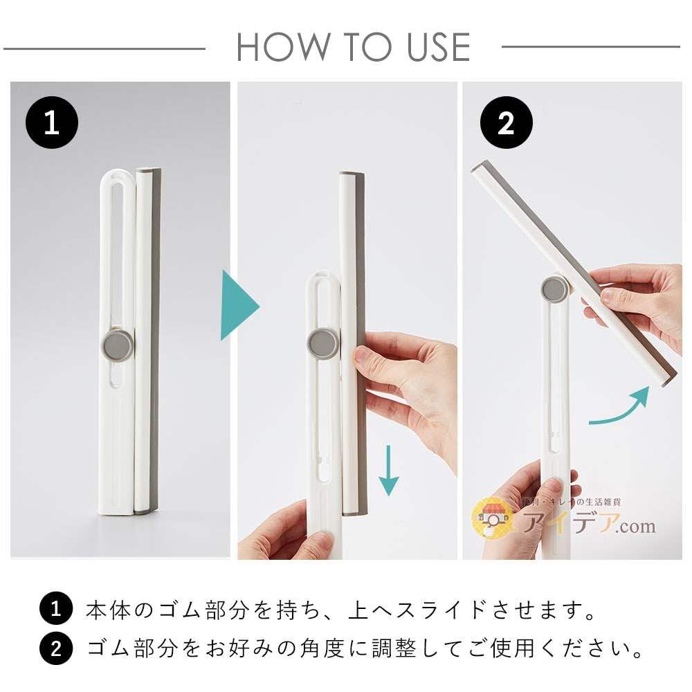 【使用方法】 ・本体のゴム部分を持ち、上へスライドさせます。 ・上までスライドさせてお好みの角度に調節してご使用ください。