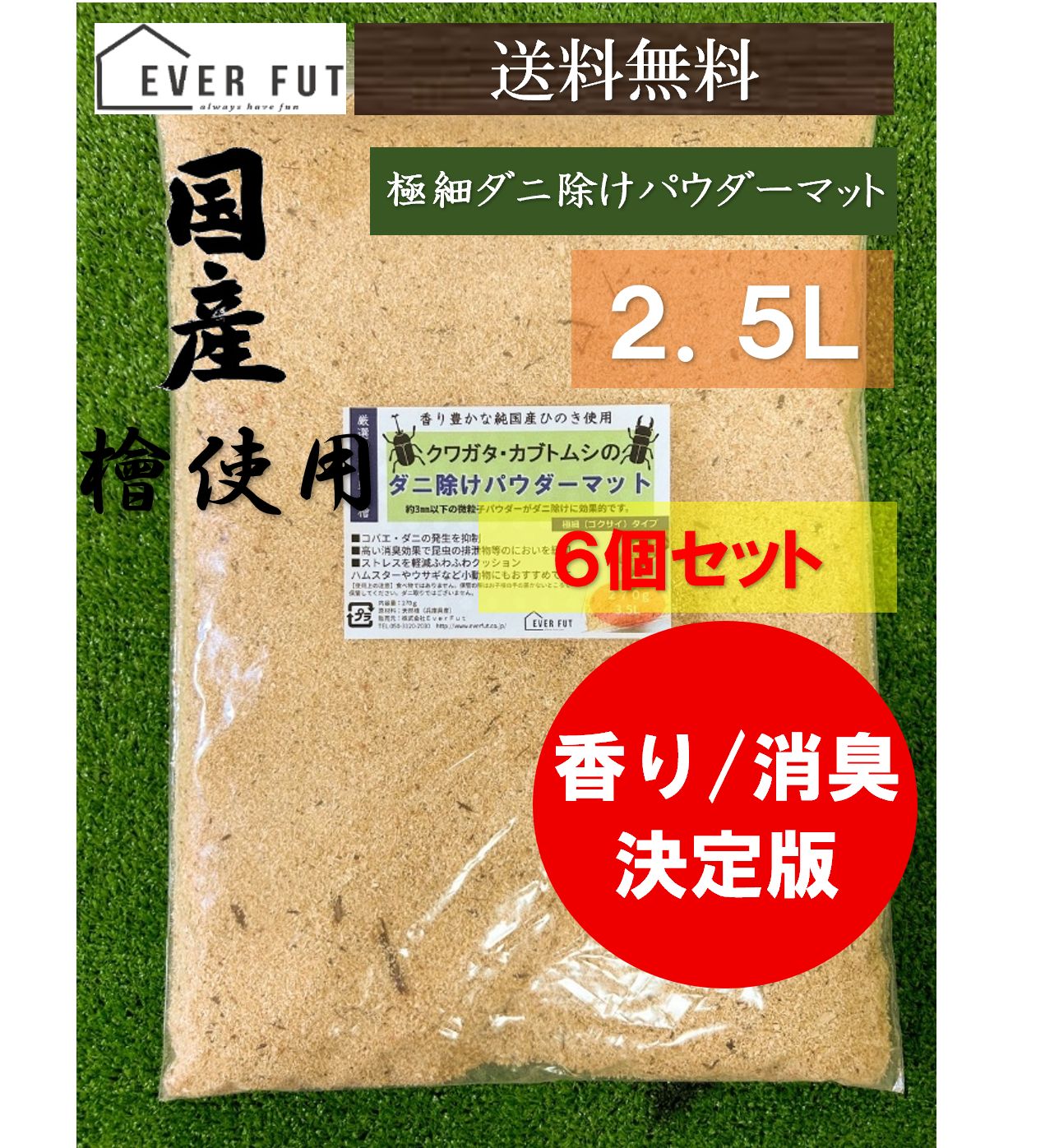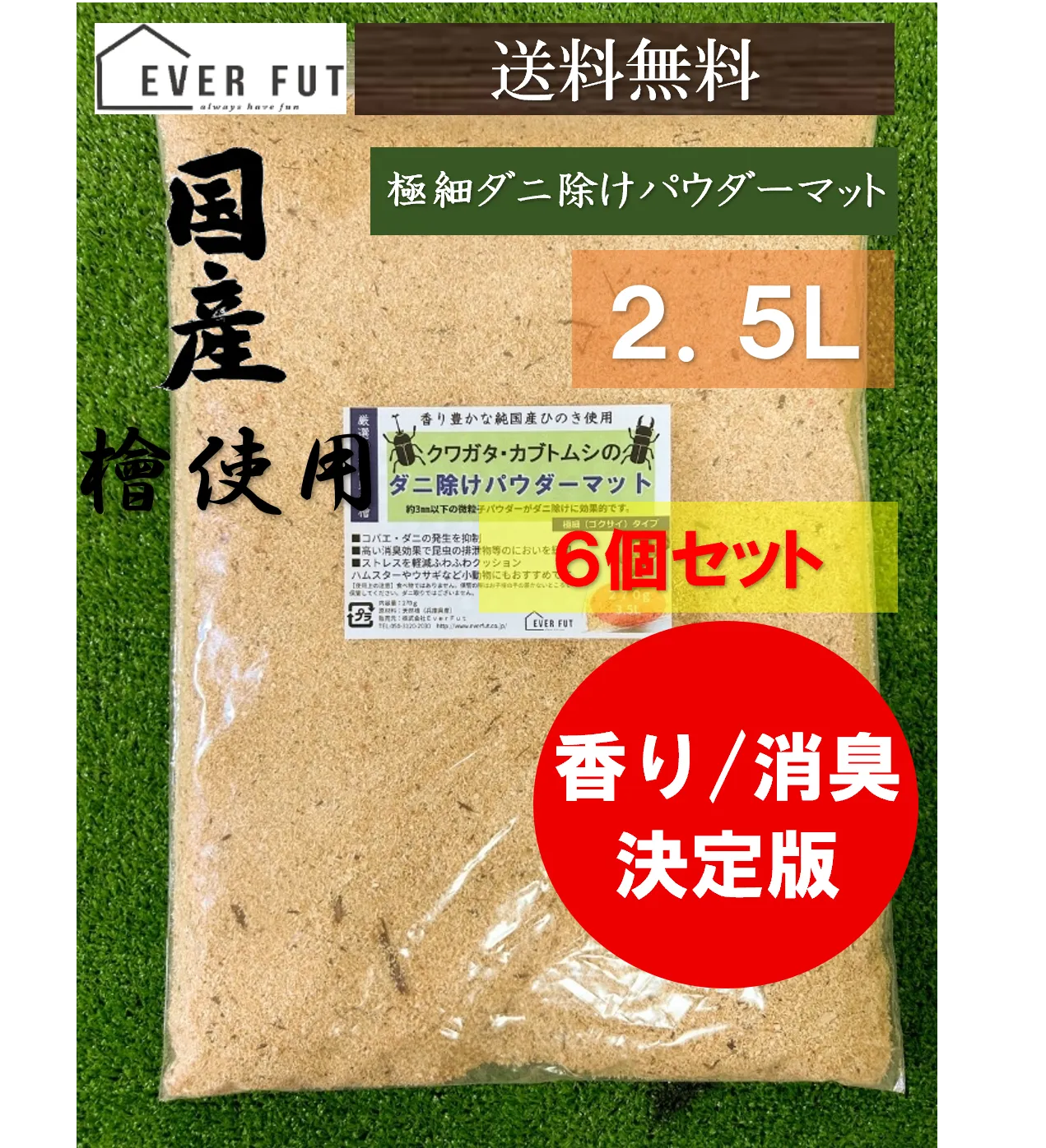 極細ダニ除けパウダー 国産檜の飼育マット2.5L 6個セット ダニ コバエ対策に!檜おが粉 ふわふわ床材 檜チップ 昆虫 クワガタ カブトムシ 小動物飼育マット