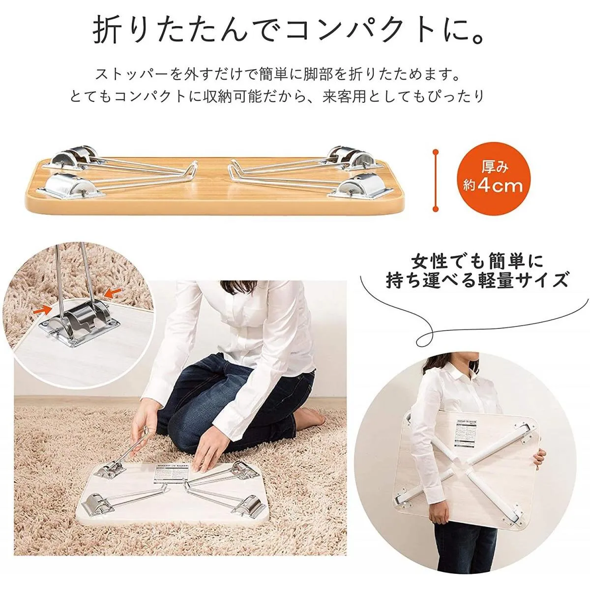【商品説明】 折りたたみ式のローテーブルは手頃なシンプルさのものが在りそうでなかなかないもの。 シンプルなデザインで、お部屋を選ばずおしゃれな雰囲気を演出します! ◇折りたたんでコンパクトに ・ストッパーを外すだけで簡単に脚部を折りたためます。 ・とてもコンパクトに収納可能だから来客用としてもぴったり♪ ◇持ち運びも楽々♪ ・女性でも簡単に持ち運べる軽量サイズです。