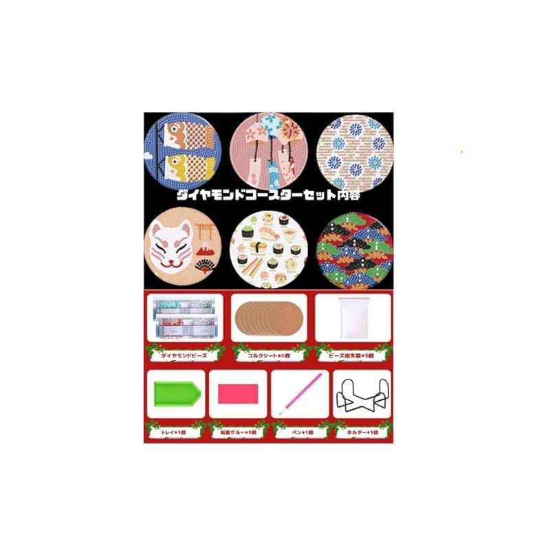 【ダイヤモンドアートコースターセットパッケージ内容】 ☆ダイヤモンドアートコースター:6枚 ☆コルクマット:6枚 ☆コースターホルダー:1台 ☆カラフルなダイヤモンド:1セット☆ビーズトレイ:1個、ダイヤモンドペン:1本 ☆グルー:1個☆チャック付ビニール小袋:5枚 ☆日本語取扱説明書付 ?