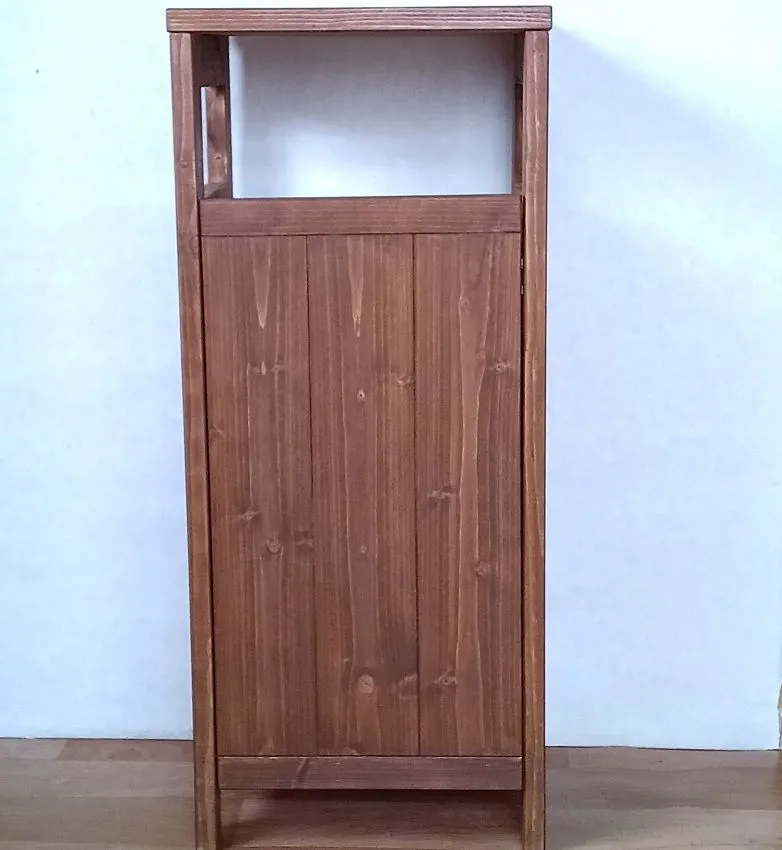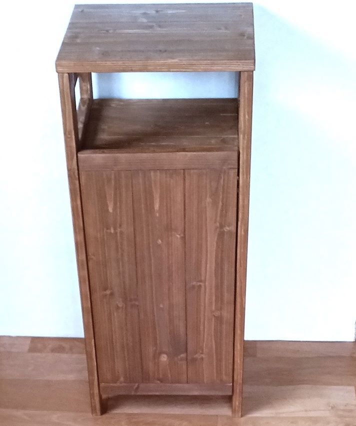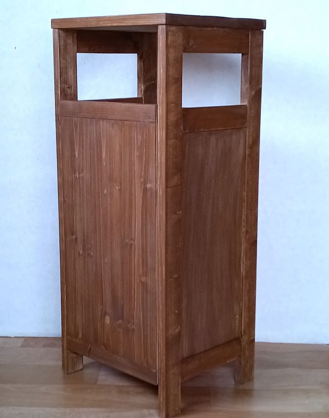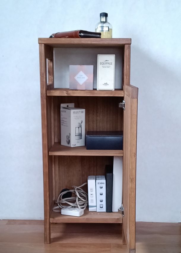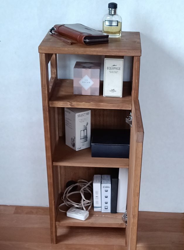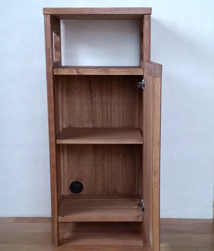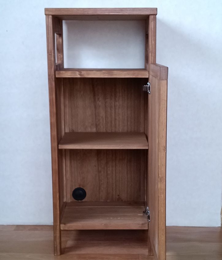 SPF無垢材で中間色ブラウンカラーのモデム、ルーターが収納できる、ナイトテーブル、フラワースタンド、電話台、サイドテーブル、が完成いたしました。