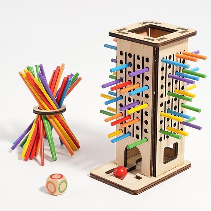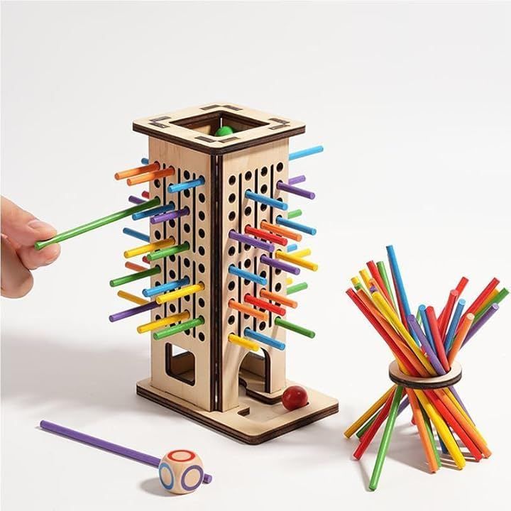 タワーゲーム: 木製タワーにカラフルな棒を差し込み、ボールを落とさないよう棒を抜くスリリングなゲームです。