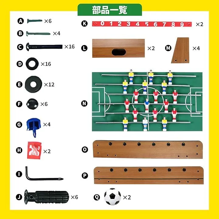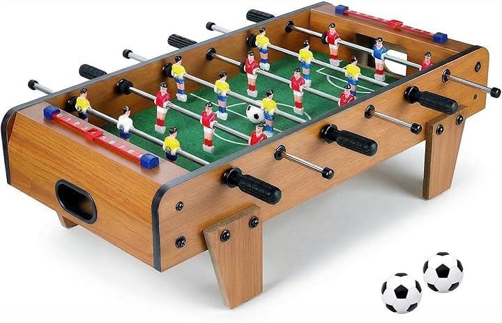 「商品詳細」 ・素材:中密度繊維板 ポリプロピレン ・カラー:木目調 ・サイズ:約25x50x16cm ・重量:約2.4kg ・付属品:ボール2個 ・特徴:コンパクト設計、滑りにくいハンドル、回転ロッド、スコアカウンター搭載 ・用途:室内遊び、家族レクリエーション、パーティー、ギフト