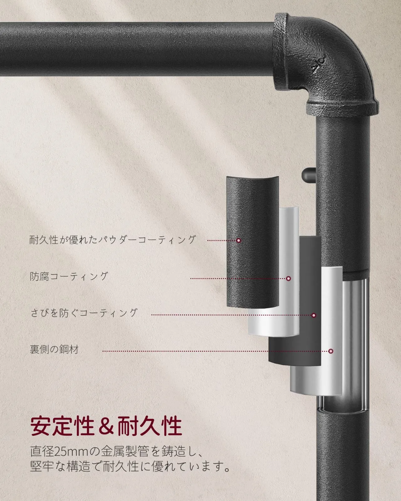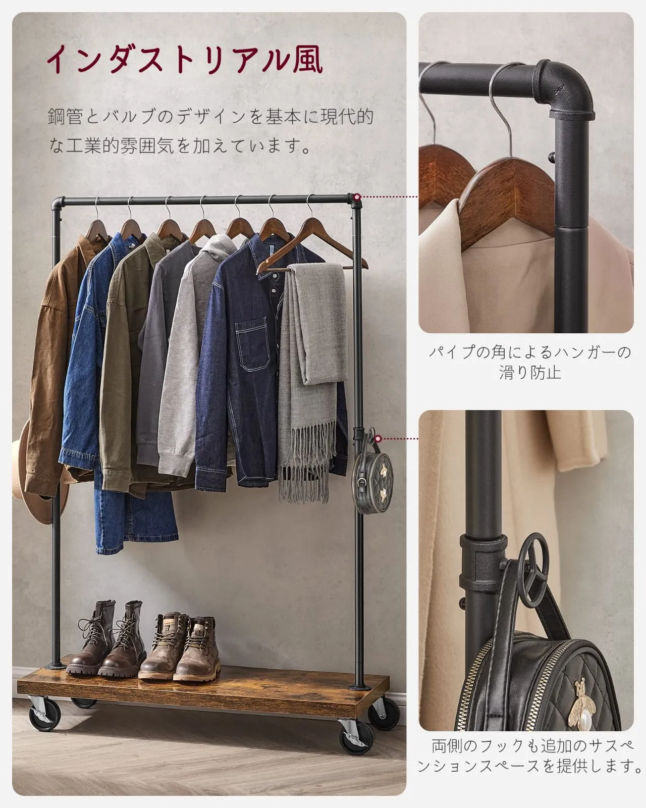 【細部へのこだわり】粉体塗装を施したフレームはサビや汚れに強い仕上がりとなっております。お手入れ簡単で、長くご愛用いただけるハンガーラックです。キャスター付きなので服などを掛けたままでもスムーズに移動できます。棚板の下も収納スペースとして活用していただけるように設計しておりますので、靴等の収納用はお薦め!