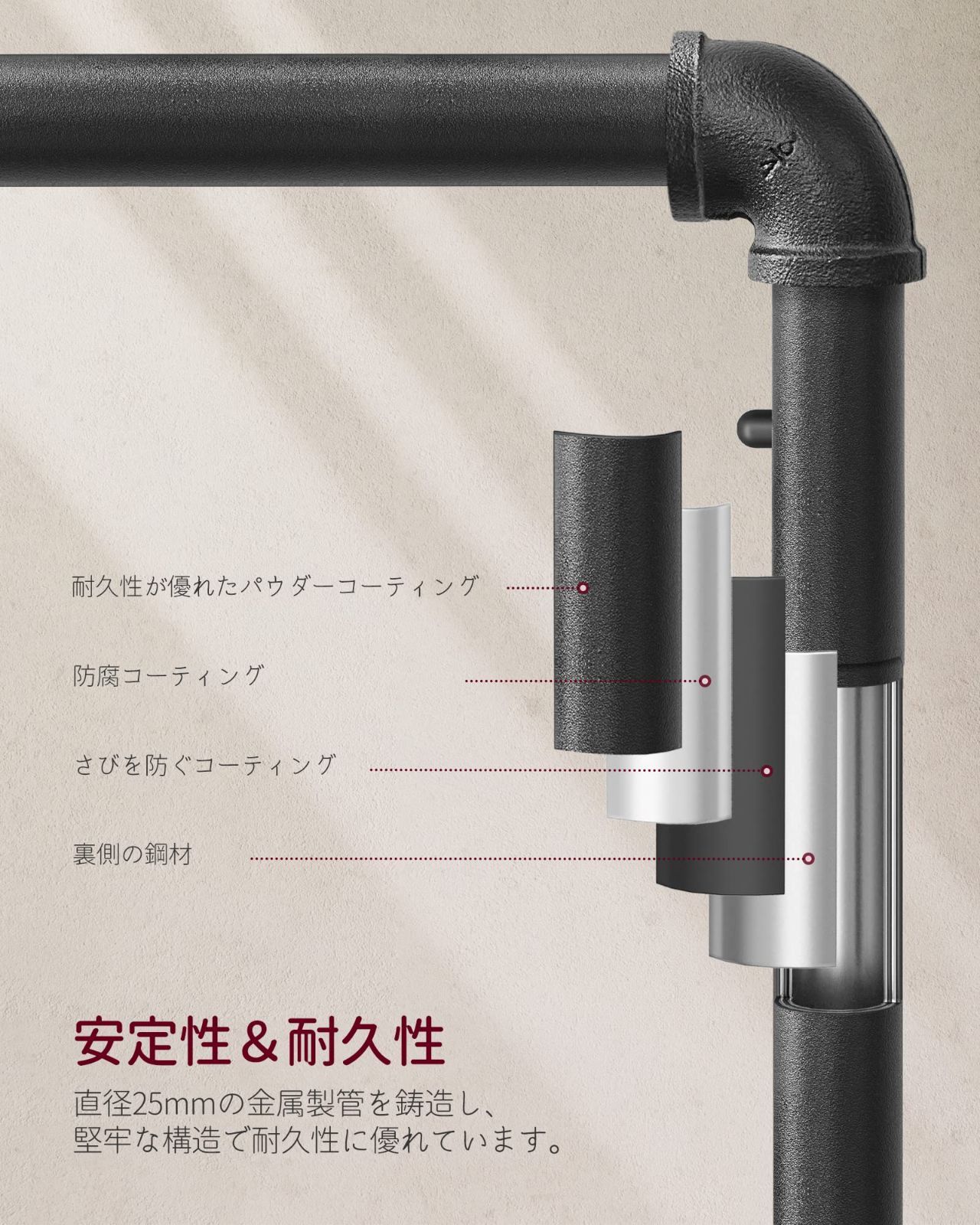 【驚きの高耐荷重】フレームとハンガー部分は頑丈なアイアンでがっちり溶接されていますので、耐荷重90㎏で充分な安定感を確保しており、重量のある厚手の衣類も安心してかけられます。下棚は高品質なパーチクルボードを採用しており、耐荷重は約25KGとなっております。
