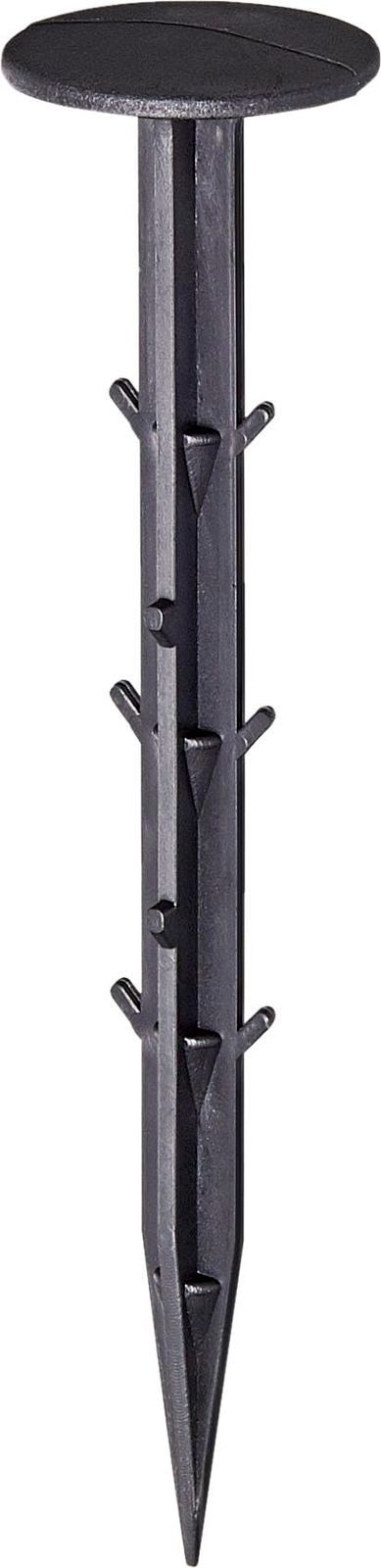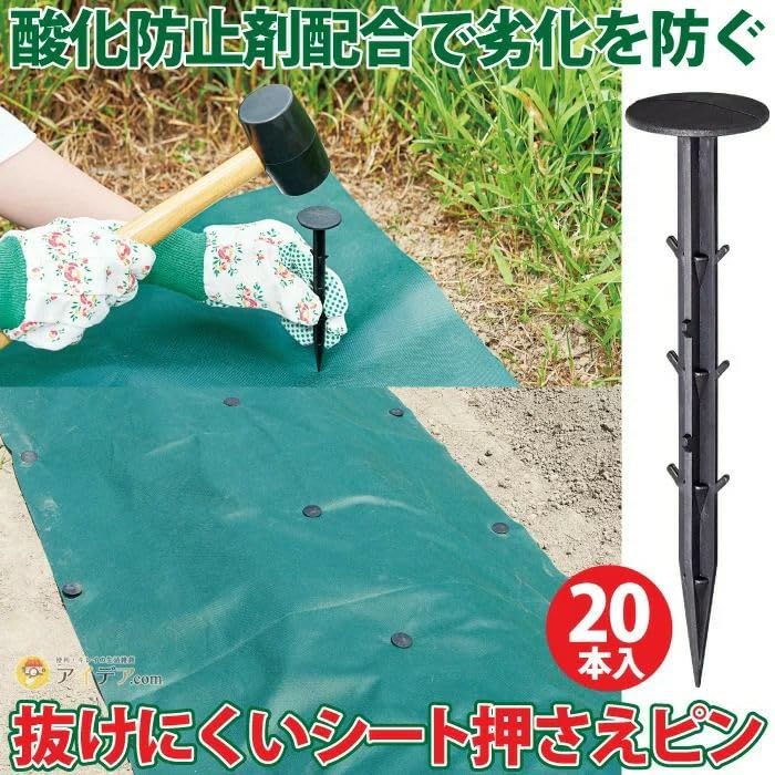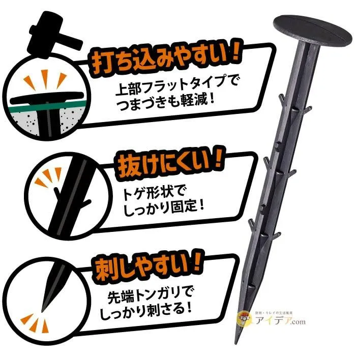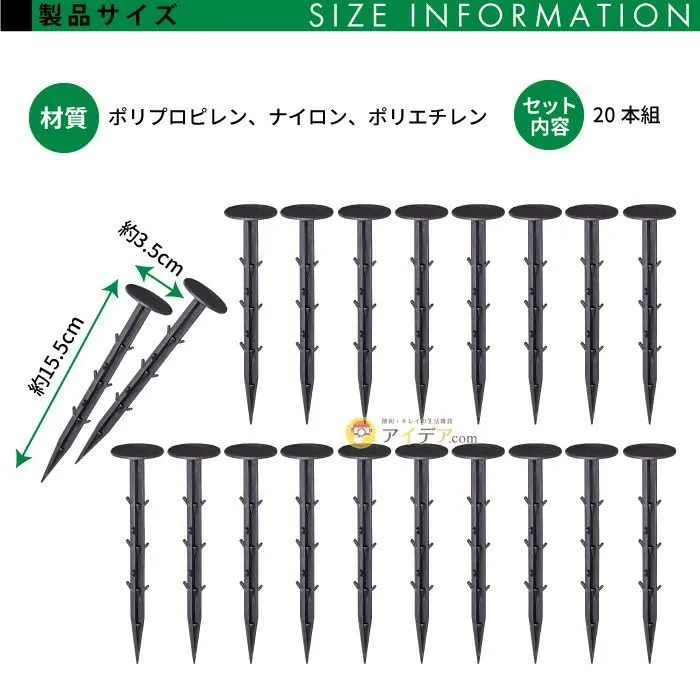 雑草防止シートの固定に便利。 打ち込みやすく、上部フラットタイプでつまずきも軽減。 トゲ形状でしっかり固定し、抜けにくい。 先端トンガリでしっかり刺さる。 お庭、家庭菜、お墓まわりにも使える。 使用方法:1m間隔を目安に、お手持ちのハンマーで打ち込んでください。 製品サイズ:直径3.5×15.5cm 重量:180.3g セット内容:20本組 材質:ポリプロピレン、ナイロン、ポリエチレン