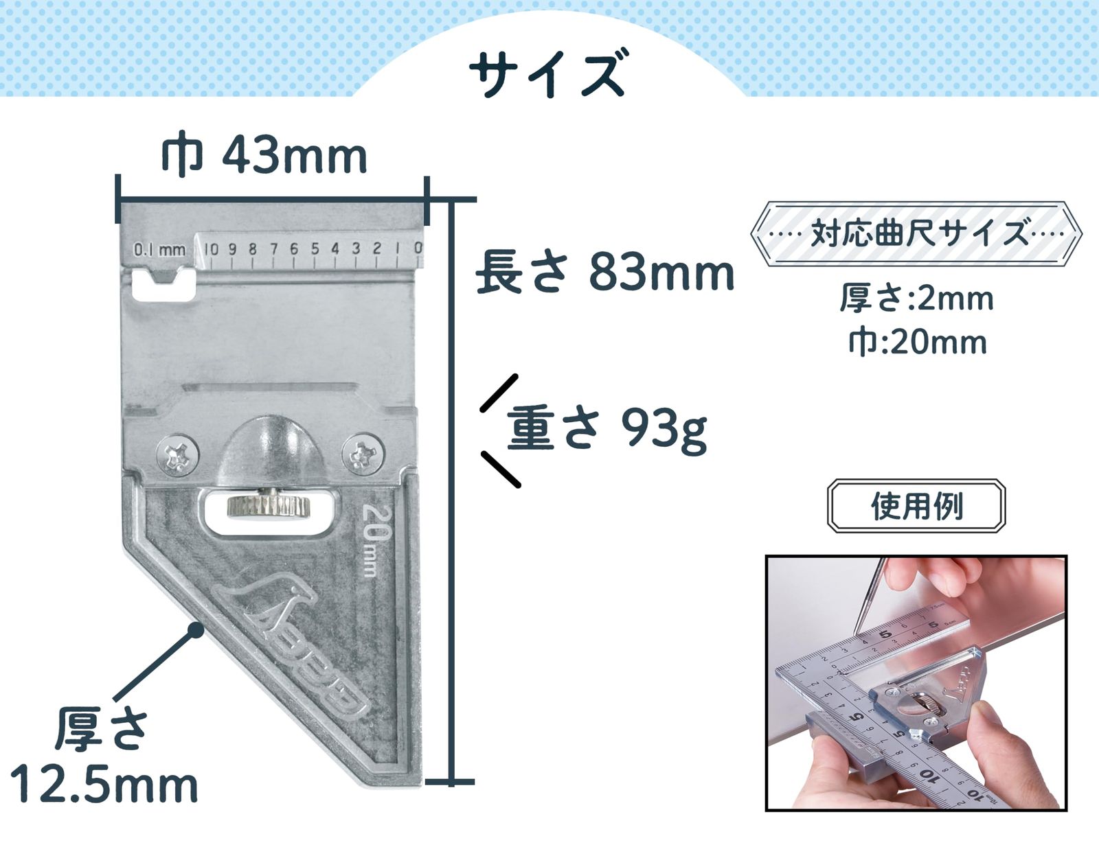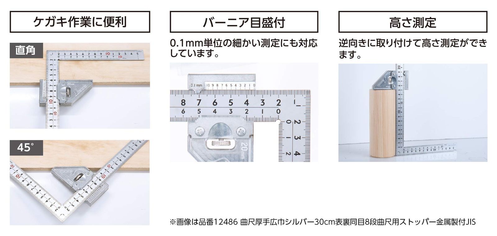 熱に強く、溶接作業にも使用できる曲尺用ストッパーです。直角・45度・平行線のケガキが可能です。