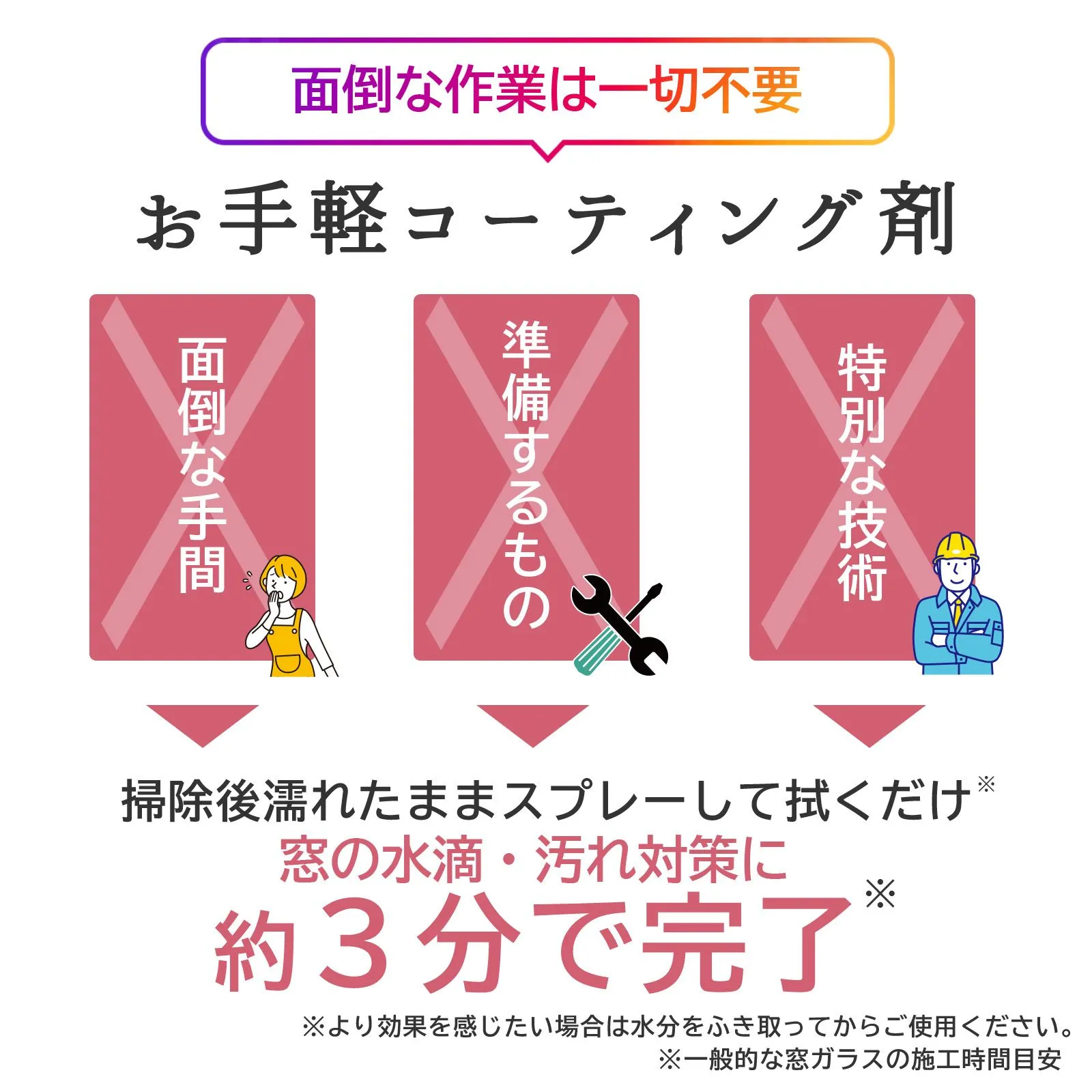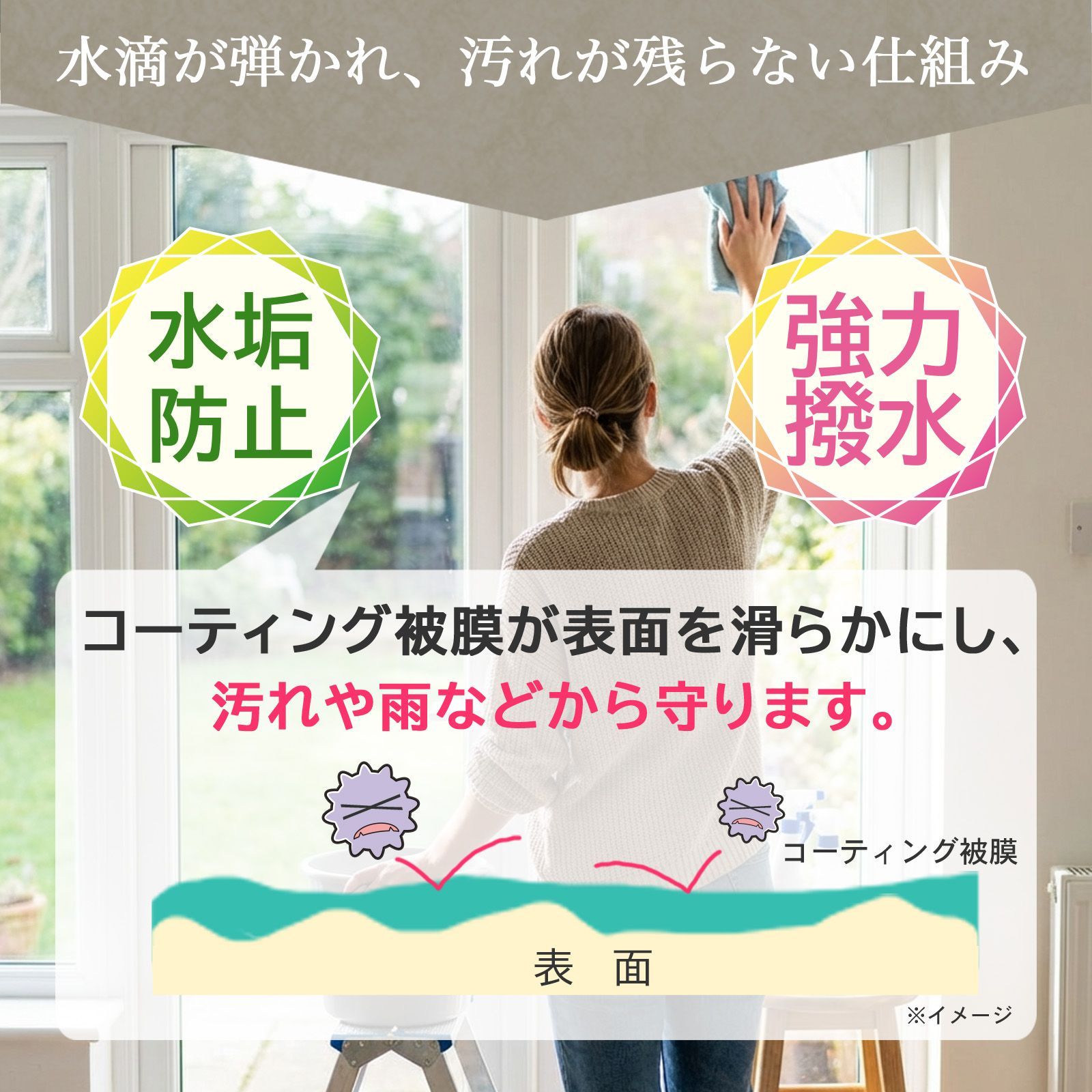 【主な特徴】 ★超撥水コーティングで水・汚れを弾く ★雨だれ・水垢・砂埃・花粉対策に◎ ★サッシやレールの掃除がラクに ★結露対策としても活躍 ★スプレーして拭くだけの簡単施工♪ ――――――――――――――――――