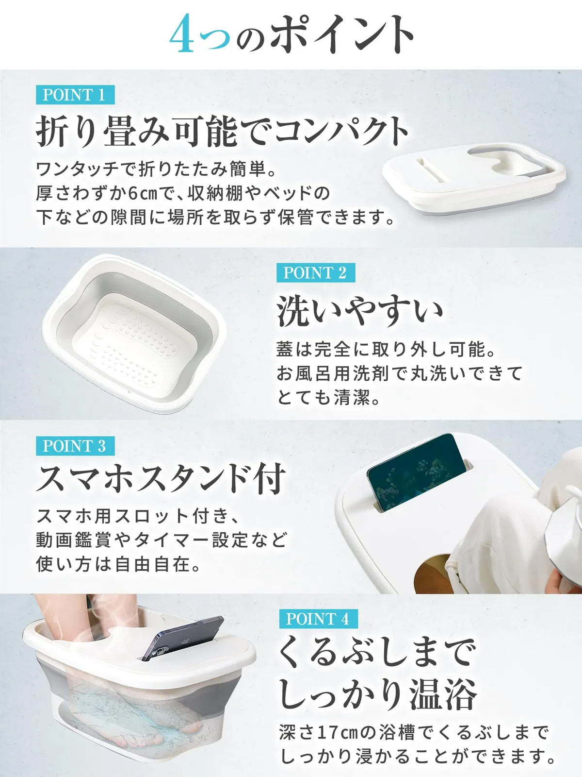 【手軽にできる足湯バケツ】ご自宅で足湯を手軽にできる蓋つきのフットバスです。蓋がついていることで保温効果も高いです。携帯を差し込める穴があるので動画を見ながら足湯をご使用することもできます。