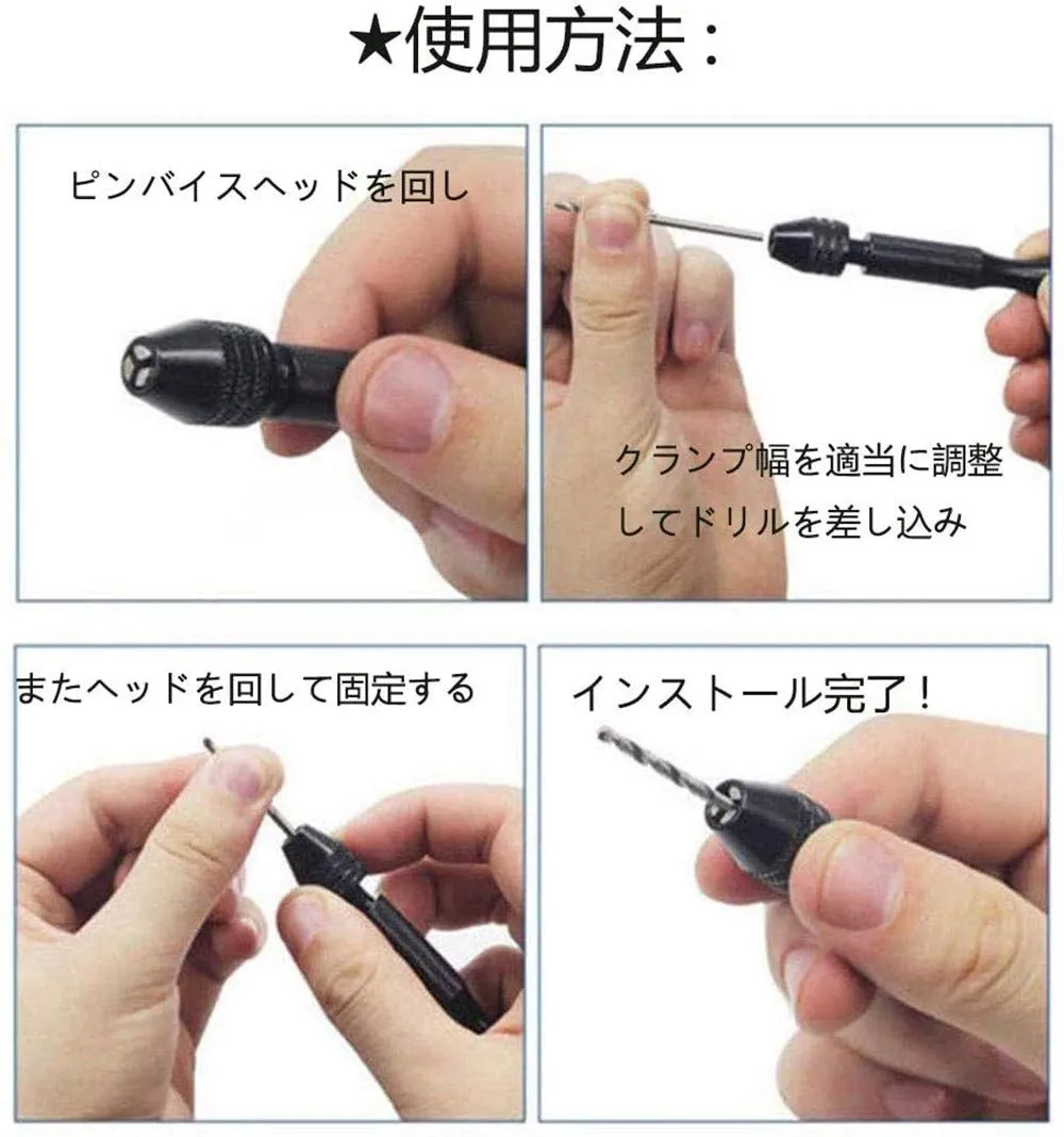 【使用方法】ピンバイスヘッドを回し、クランプ幅を適当に調整してドリルを差し込み、またヘッドを回して固定する。作業相手を固定して、ドリル頭部を手に当て、回転すれば穴が開きます。※DIY用のハンドドリルなので、ご使用なさる時に少し工夫が必要のことご注意ください。