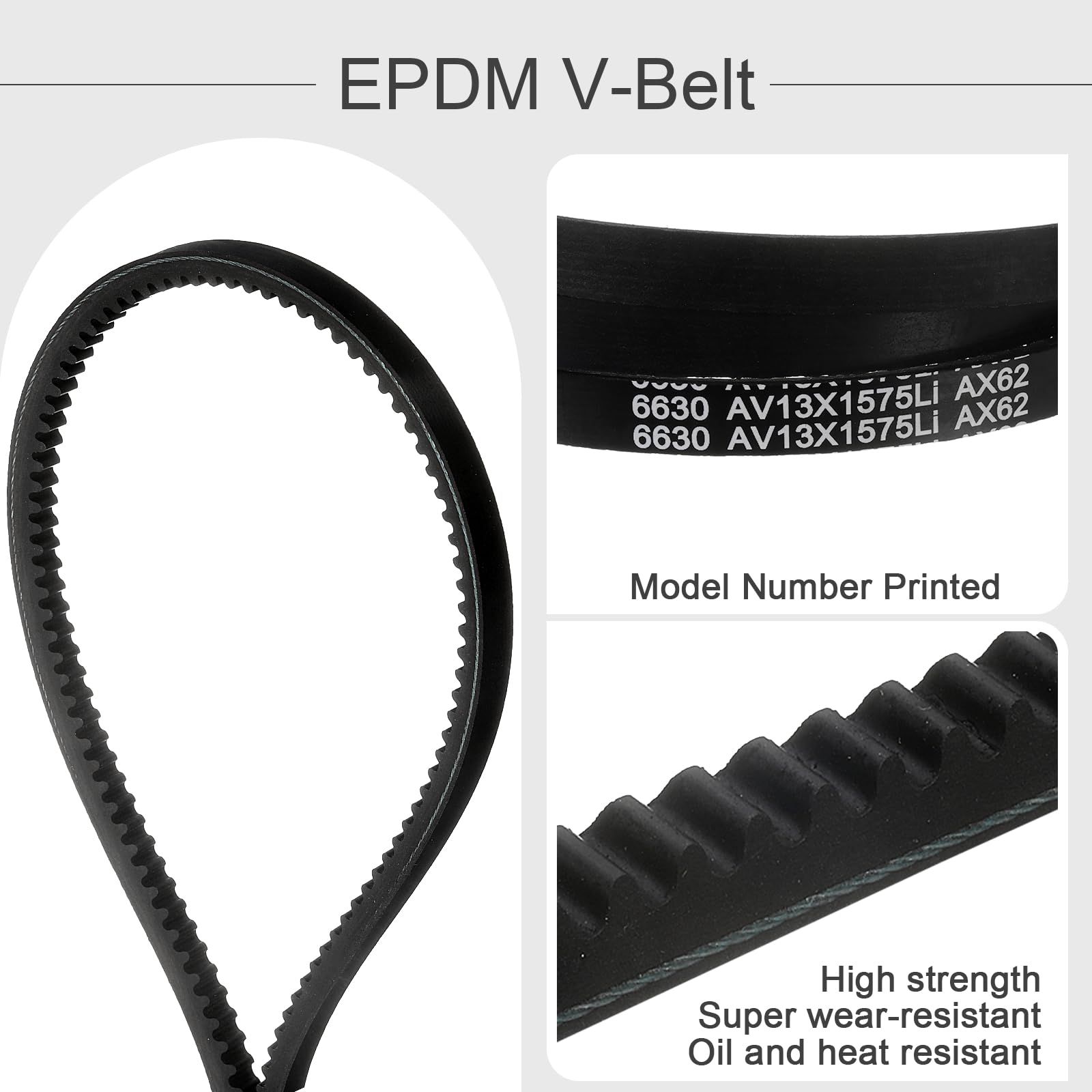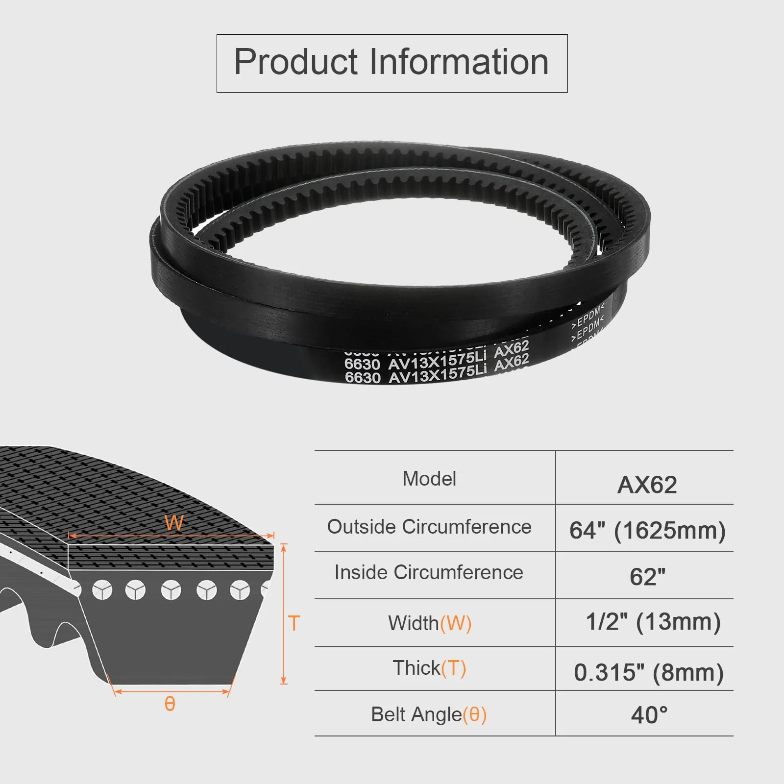 サイズ - AX62 クラシック コグド V ベルト、内周: 62 インチ、外周: 64 インチ (1625 mm)、幅: 1/2 インチ (13 mm)、厚さ: 0.315 インチ (8 mm)