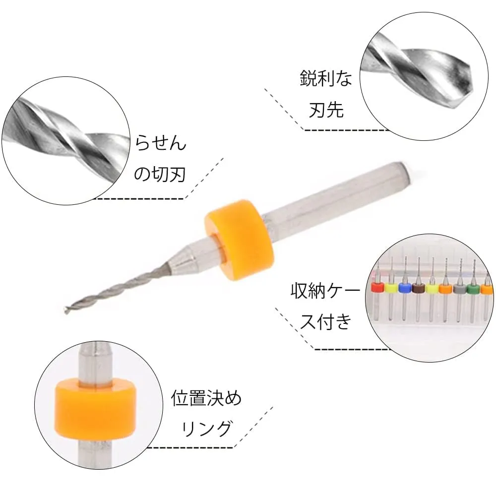 セット内容:極細ドリルビット10本セット(収納ボックス付き)、サイズ:0.3-1.2mm(0.1、0.2、0.3、0.4、0.5、0.6、0.7、0.8、0.9、1.0mm)。カラー:カラフル(色ランダム)。