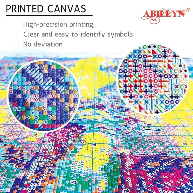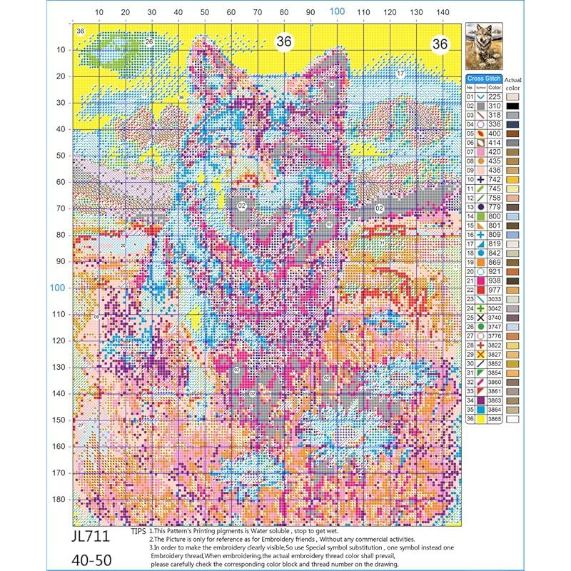 【高精細プリント技術】生地には色分けされ記号が付けられた小さなマス目が明確にプリントされています。各記号は糸の色に対応しており、チャートには記号と対応する糸の色が表示されています。チャートは通常キャンバスの側面に印刷されています。