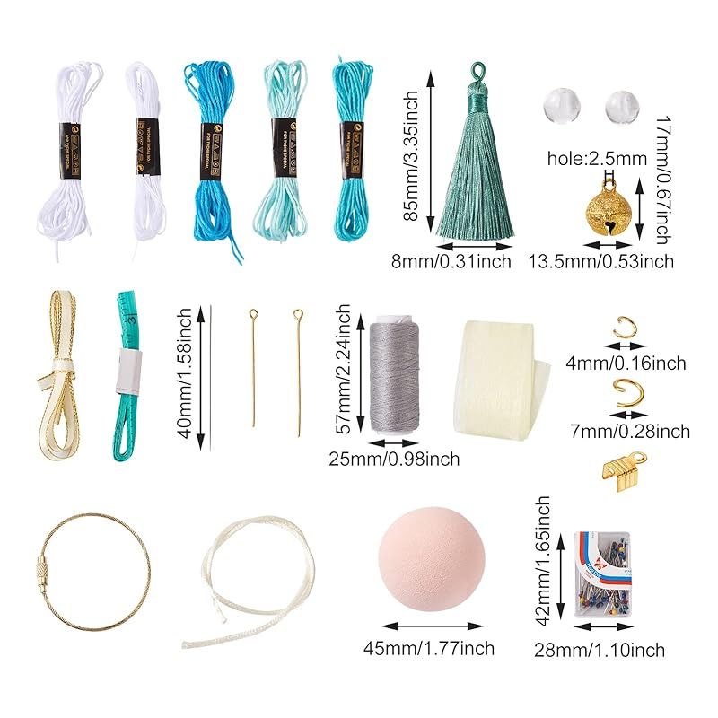 【パッケージ内容】:ラウンドボール*1個+ニードル*1箱+テープメジャー*1個+コットン糸*5束+ライン*1巻+オーガンジー1本+リボン1本+ロープ1本+タッセル*1個+鈴ベル*2個+針*1本+9ピン*4本+ビーズ*3個+丸カン*12個+リング金具*1個+エンド金具*2個+英語の説明書。