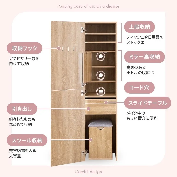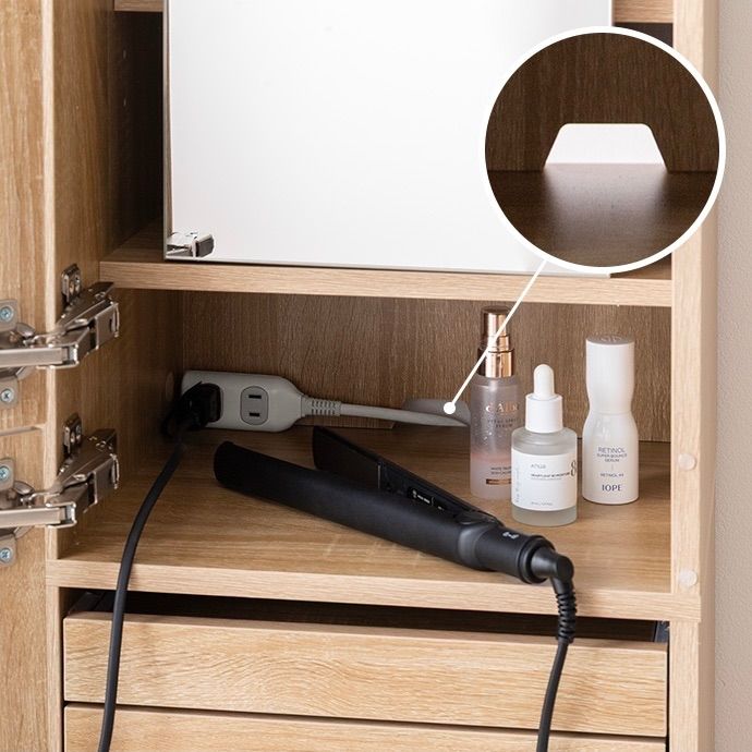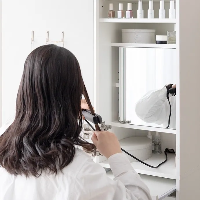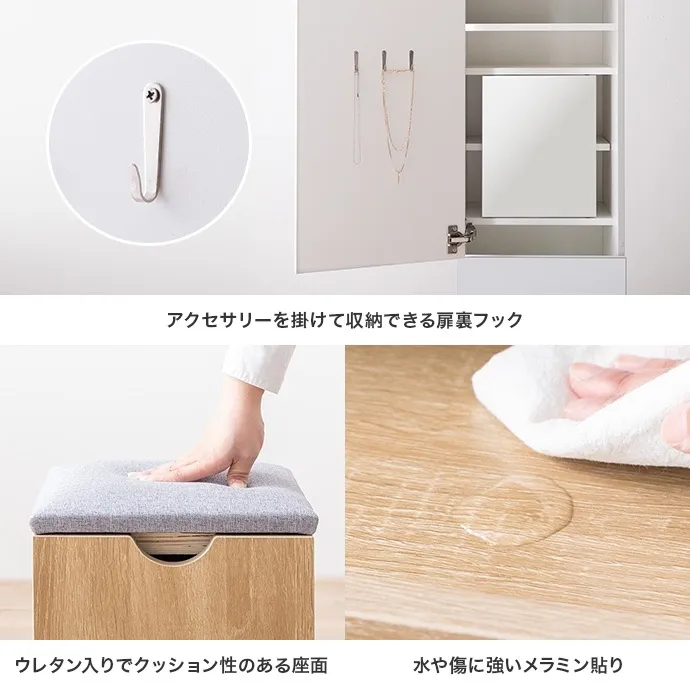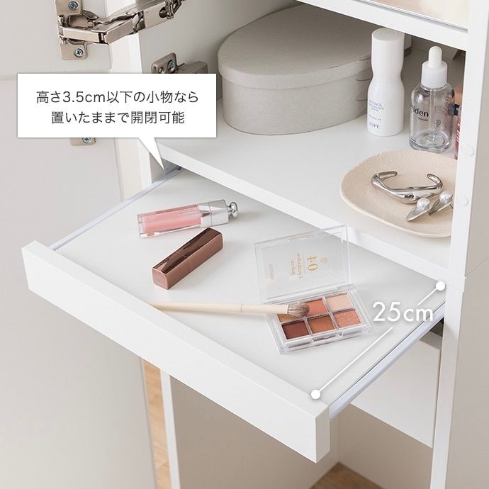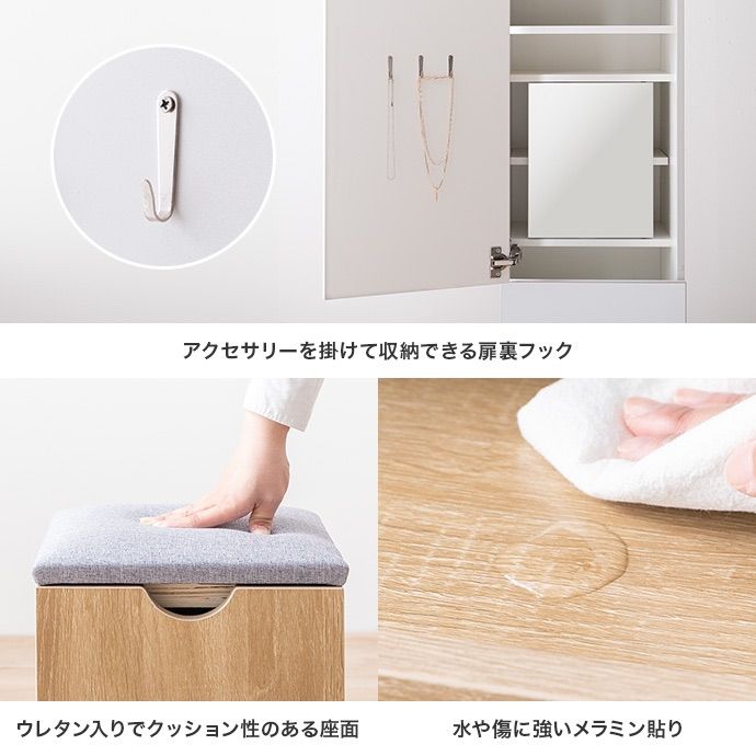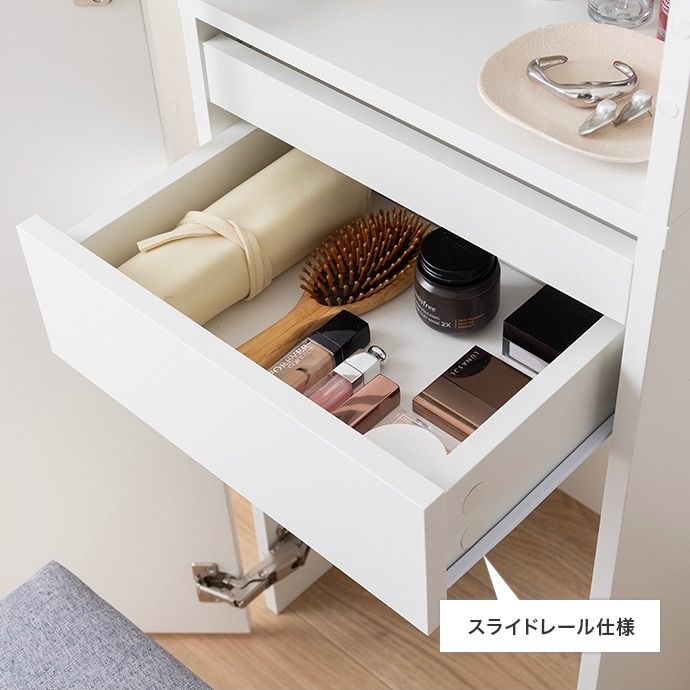 鏡裏やスツール内など見えない場所にもたっぷり収納を備え、コスメはもちろんアイロンなどの美容家電もすっきり収納いただけます。さらに引き出しとスライドテーブル付きで、道具を広げても快適に使える設計。毎日のメイクを心地よく整える、こだわりの1台です。
