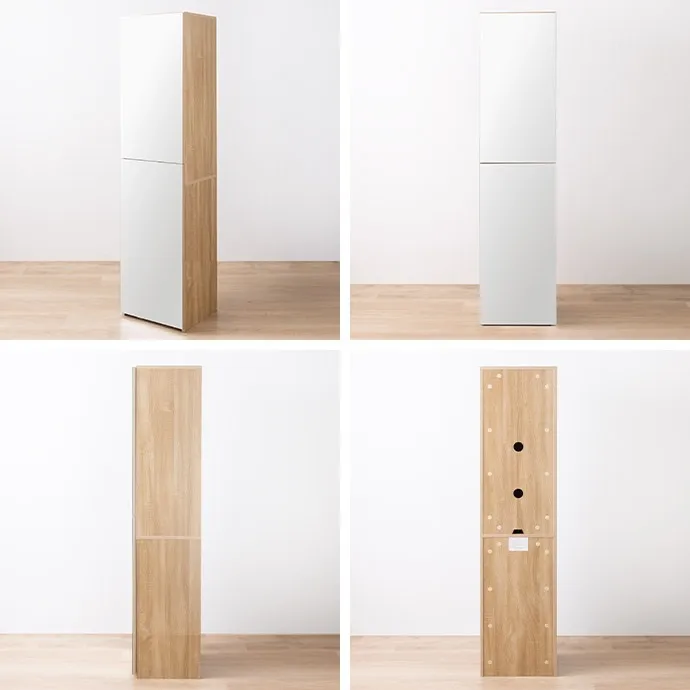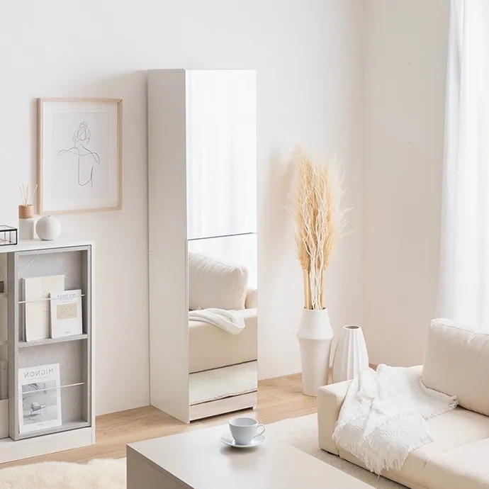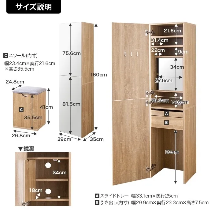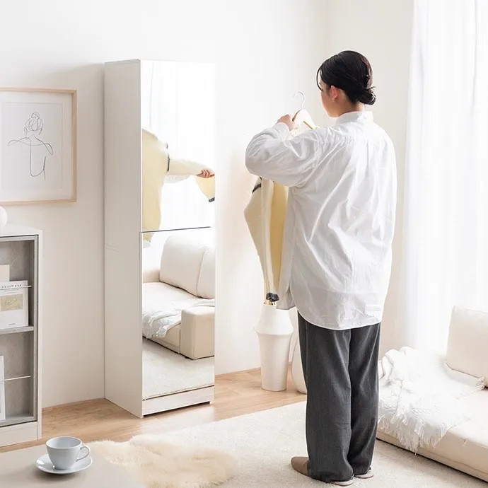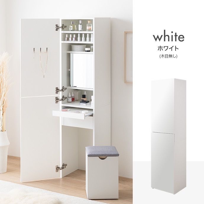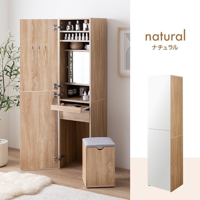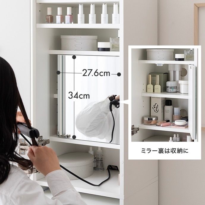 扉を閉じれば全身ミラー、開ければ大容量収納付きのメイクスペースに早変わり。