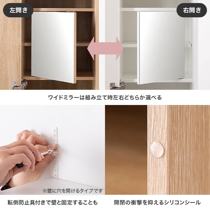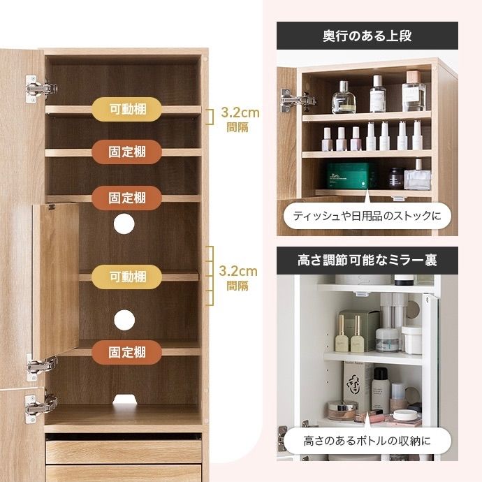 【耐荷重】上段可動棚:約3kg、上段固定棚:約3kg、ミラー裏固定棚:約2kg、ミラー裏可動棚:約2kg 中央天板:約5kg、スライドテーブル:約3kg、引き出し底板:約5kg、スツール:約70kg、サイドフック:各約0.5kg ※プラスドライバーをご用意ください。