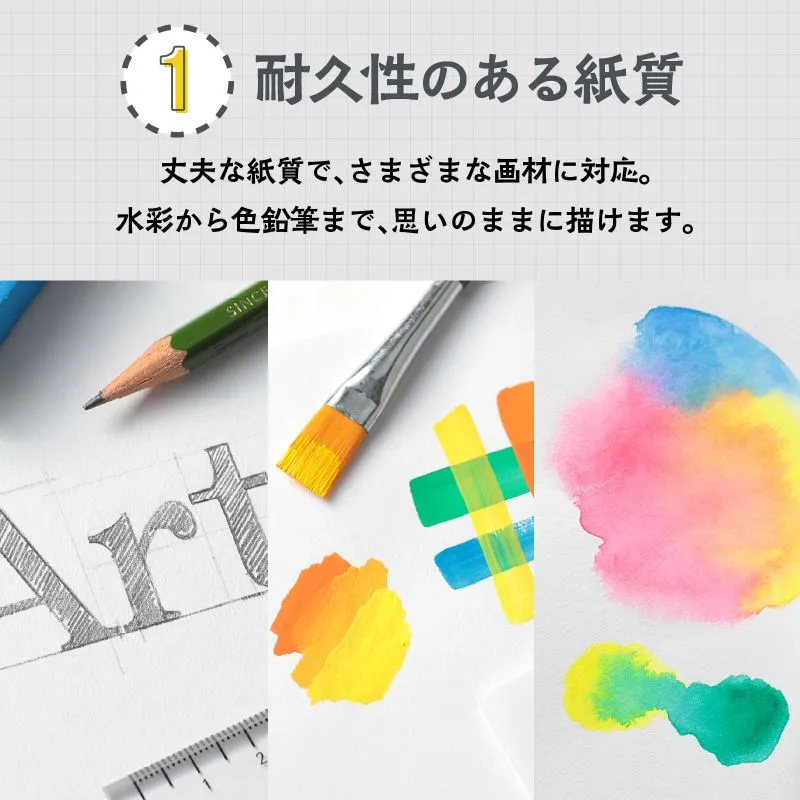 ■完成サイズ:用紙サイズ:297×210mm 高品質な厚口165gの本文用紙を使用した、アーテックオリジナルのA4スケッチブックです。鉛筆や色鉛筆はもちろん、水彩など幅広い画材に対応し、思いのままに表現できます。本文は24枚。しっかりとした紙厚で、描き心地にこだわりました。裏表紙には厚みのあるチップボール紙を採用しており、下敷きなしでも安定して描けるので、机がない場所でも快適に使用できます。ダブルリング製本により、ページをしっかり固定。めくりやすさと耐久性を両立し、ストレスなく使えます。持ち運びしやすいA4サイズで、日常のスケッチからアイデアメモ、作品制作、プレゼンテーション用のラフ作成まで幅広く活躍します。丈夫な紙質とシンプルなデザインで、年齢や用途を問わず使いやすいスケッチブックです。 ※お使いのモニター設定、お部屋の照明等により実際の商品と色味が異なる場合がございます。