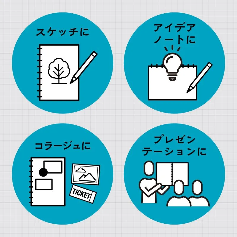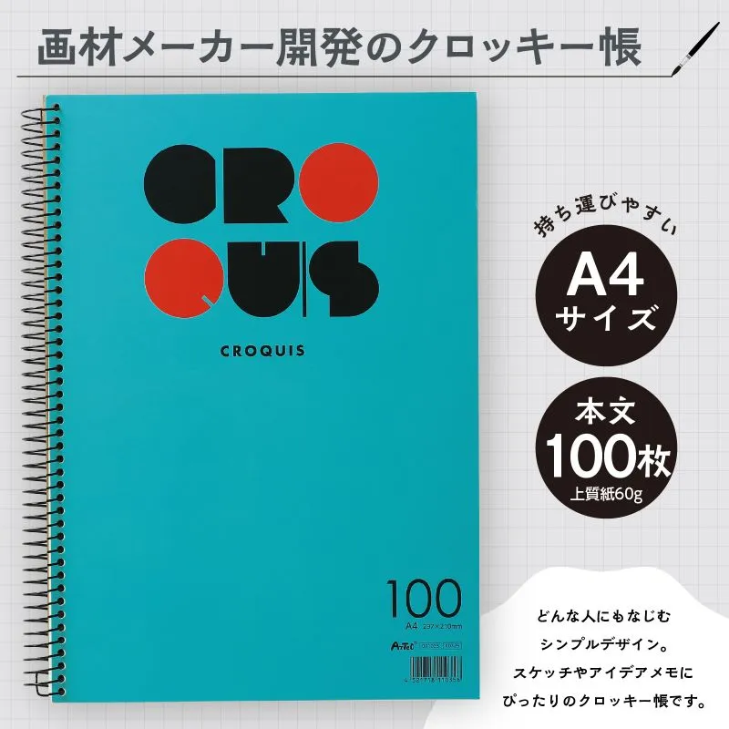 ■完成サイズ:用紙サイズ:297×210mm 上質紙60gの本文用紙を使用した、使いやすさにこだわったA4サイズのクロッキー帳です。自然な色合いの紙質で、長時間描いても目が疲れにくい設計です。本文は100枚。裏表紙には厚みのあるチップボール紙を採用しており、下敷きなしでも安定して描けるので、机がない場所でも快適に使用できます。ダブルリング製本により、ページをしっかり固定。めくりやすさと耐久性を両立し、ストレスなく使えます。表紙は3色展開で、用途や目的別に色分けして管理することも可能です。持ち運びしやすいA4サイズで、日常のスケッチからアイデアメモ、作品制作、プレゼンテーション用のラフ作成まで幅広く活躍します。丈夫な紙質とシンプルなデザインで、年齢や用途を問わず使いやすいクロッキー帳です。 ※お使いのモニター設定、お部屋の照明等により実際の商品と色味が異なる場合がございます。