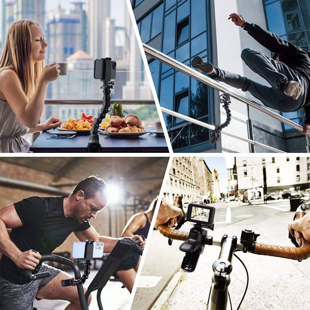 【多様なデバイスに対応】 アクションカメラや1/4インチネジ穴付き小型カメラに直接取り付け可能。また、付属のスマートフォンホルダーを使用してスマホ撮影も可能です。GoProシリーズ(Hero 13からHero 2)、Akaso、DJI Osmo、Insta360などのほか、Arloシリーズや1/4ナットコネクタを備えたカメラに適しています,携帯電話など。
